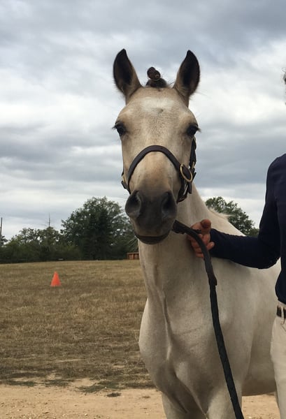 Débourré cet été, il se révèle d'un tempérament calme. Habitué aux longues rênes, il évolue aujourd'hui monté aux 3 allures en filet simple ou bitless. Merovee a participé à deux concours Modèles et Allures (protocoles disponibles), avec passage en saut liberté, et a obtenu la certification PRATIC (prendre les pieds, mettre/enlever une couverture, licol, toise, respect de l'homme, etc.) Il voyage aussi bien en van qu'en camion 🚚