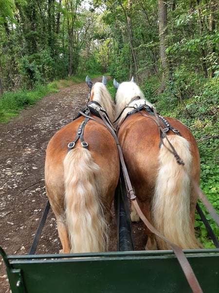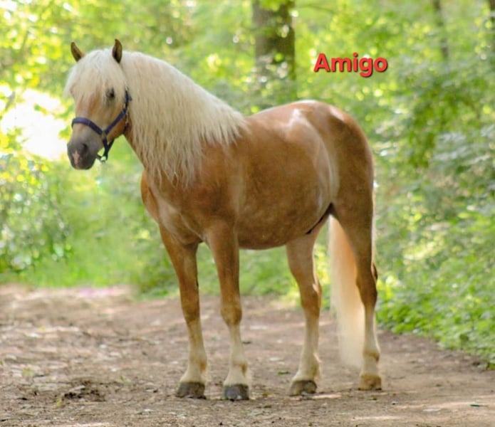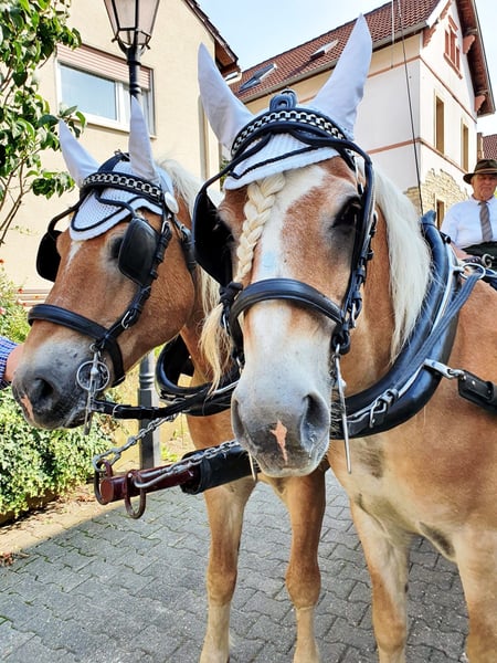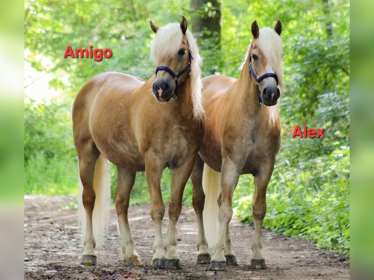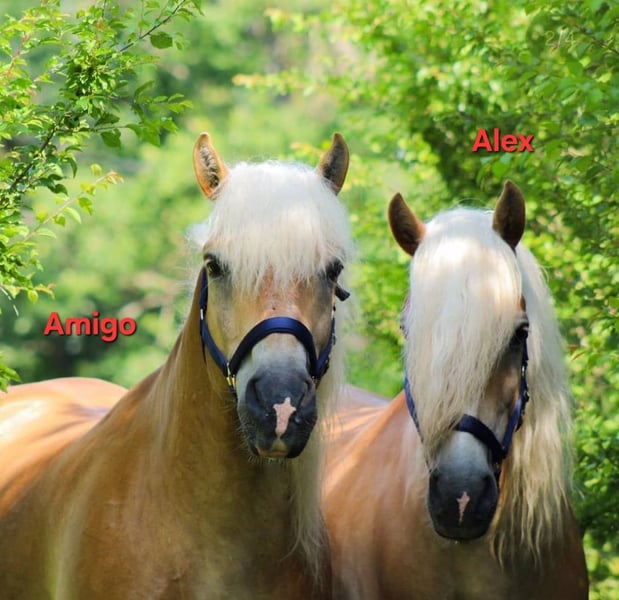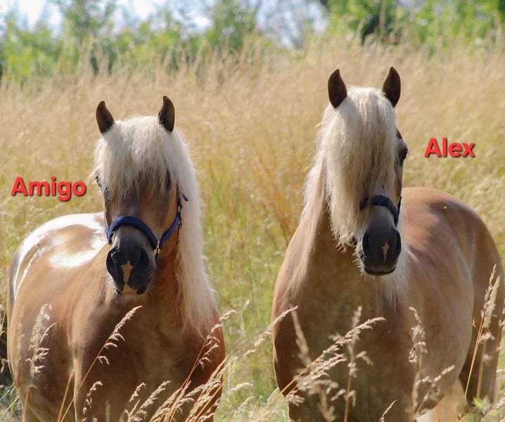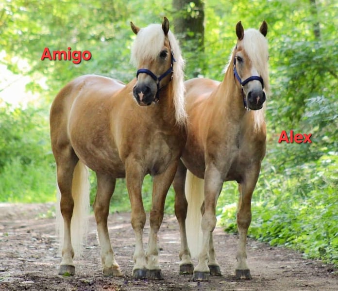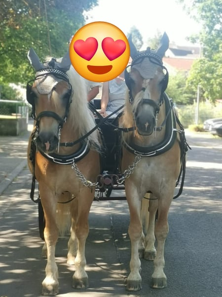 Wir verkaufen schweren Herzens aufgrund von Verkleinerung dieses wirklich tolle Fahrgespann. Sie sind von Geburt an nicht getrennt worden und sind auch unzertrennlich. Sie werden nur zusammen verkauft. Zu Amigo: Amigo wurde am 17.04.2008 geboren. Er ist ein sehr robuster Haflinger. Charakterlich überzeugt er von seiner Unerschrockenheit. Wie sagt man so schön harte Schale - weicher Kern. Er zeigt aber auch gerne die typischen Haflingerzüge. Man sollte Durchsetzungsvermögen haben. Zu Alex: Alex wurde am 15.03.2008 geboren. Er ist ein sehr sensibles/feines Pferd. Das passende Gegenstück zu seinem Halbbruder Amigo. Die Bodenarbeit macht ihm sehr viel Spaß. Beide Pferde weißen ein Stockmaß von ca. 150cm auf. Als Fahrgespann sind zu jederzeit zuverlässig und von Einsteigern zu händeln. Sie sind schmiede- und verladefromm, kennen den Straßenverkehr. Auch waren sie schon bei einer Hochzeit dabei und haben die Braut mit Brautvater sicher an die Kirche gebracht und das Brautpaar durch Ort geleitet. (Kirchenglockenleuten, mehrere Personen auf einem Fleck sind unproblematisch). Abduschen mit einem Wasserschlauch, Fliegen und Mähnenspray sind unproblematisch. Sie stehen bei uns in einem Offenstall (Herbst/Winter) und im Frühjahr/Sommer auf der Koppel. Aufgrund ihrer Liebe zum Essen bekommen sie ihr Heu in einer Heuraufe mit Heunetz. Die Koppel wird etwas abgesteckt bzw. über Tag immer weitergestellt. Sie sind herdenverträglich. Sie kennen es beschlagen zu sein - gerade, wenn man regelmäßig auf Asphalt unterwegs. Amigo und Alex kennen beide auch den Sattel und das Reitergewicht. Sie werden nicht als Reitpferde verkauft! Sie lassen sich beide longieren und wurden am Langzügel und Doppellonge gearbeitet. Wir wünschen uns für sie zusammen ein zu Hause mit Herz auf Lebenszeit. Gerne kann auch die passende Kutsche mit Geschirr käuflich erworben werden.