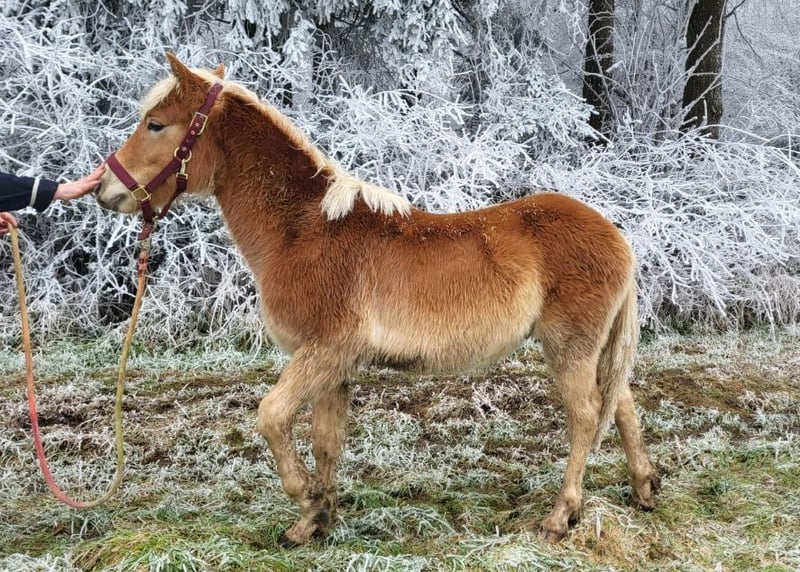 Pepino – our little charmer and cuddle king has been with us since October, will turn one year old in March, and has learned a lot since he moved from the mountain pasture. He walks nicely on the halter and has integrated well into the herd. Not as bold as his buddy Sofus, he likes to hide behind him when situations get too scary. He has also learned to watch the older horses and see how they behave. That's why he now greets the tractor with joy when it brings fresh hay and already knows all the vehicles that deliver his food. He stands calmly for the vet, takes deworming treatments without a halter, and offers his front hooves without being held, but he is not too keen on having his hind legs touched, so a bit of patience is needed to convince him. But we are sure he will manage that soon without any issues. The farrier still finds him very well-behaved. He is already familiar with dogs, chickens, and ducks, as well as everything else that roams in the forest. Has Pepino piqued your interest? Then get in touch, and the charmer can soon wrap you around his little finger too.