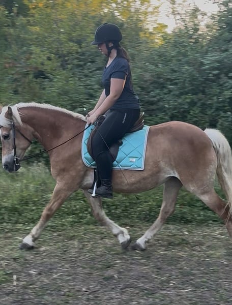 GYPSY LADY is a 1.47 m tall, 18-year-old Haflinger mare, known for her affectionate nature and versatility. She still has plenty of energy and loves to be challenged and motivated. She is a true all-rounder—whether it’s dressage, groundwork, jumping, or relaxed trail riding, Gypsy brings joy to every discipline. Her reliable and gentle manner makes her an excellent partner for riders looking to develop their skills. Thanks to her calm temperament and easy handling, she can also be confidently offered as a children's pony. She has already been used successfully at events such as St. Martin’s lantern rides and has always performed flawlessly. In the field, Gypsy is very sure-footed and brave, enjoying varied routes. During walks, she is attentive, listens well, and easily adapts to her handler’s pace. She also takes great pleasure in learning new tricks and circus-like tricks. A few months ago, she was diagnosed with a chronic cough, which, according to the veterinarian, causes little restriction with sufficient exercise. Due to lack of time, she currently has some muscle loss, but with regular training, she will quickly regain her condition. We are offering her for €2,300 negotiable, including accessories. We wish for Gypsy a loving forever home with a caring person who has the time, joy, and patience to work with her and to make use of her many talents. *Sale not to be made to dealers or riding schools!* This is not an urgent sale; she is being rehomed solely due to lack of time and is intended to go to a good, caring home.