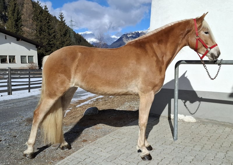 Greace is a tall, modern Haflinger mare with excellent, expressive movement. She was the winner of her foal class at the Vinschgau Foal Evaluation and was also nominated for the South Tyrol Foal Championship, where she was placed in the prestigious highest show class 1A. At one year old, she participated in the Haflinger Festival (South Tyrol Regional Show celebrating 150 years of Haflinger) and achieved an impressive 4th place. She is familiar with the horse treadmill, has been lunged, and is currently being backed. Traveling in a trailer is no problem for her. For more information, please contact ONLY by phone: +43 664 7372 5393.