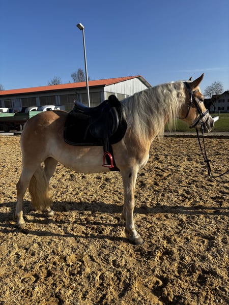 Haflinger Stute, geb. 2022, mit einem Stockmaß von ca. 148 cm Diese charmante Haflinger Stute wurde im Jahr 2022 geboren und besticht durch ihre freundliche Erscheinung und ihr angenehmes Wesen. Mit einer Schulterhöhe von etwa 148 cm ist sie perfekt für den ambitionierten Freizeitreiter oder Nachwuchsreiter, der Wert auf eine gut gerittene und zuverlässige Begleiterin legt. Die Haflinger ist bekannt für ihre robuste Konstitution, ihre freundliche Natur und ihre Vielseitigkeit. Sie ist gut ausgebildet, fein an den Zügel und zeigt eine harmonische Grundausbildung. Diese Stute wurde selbst von mir eingeritten und ausgebildet. Sie hat ein freundliches Wesen und zeigt eine ausgeglichene Charaktereigenschaft, was sie zu einer idealen Partnerin für den täglichen Reitunterricht oder die Freizeitgestaltung macht. Sie ist momentan Barhuf und kennt den Hufschmied. Wenn Sie auf der Suche nach einer zuverlässigen, gut gerittenen Haflinger-Stute sind, die sowohl für den Turniereinstieg als auch für entspannte Ausritte geeignet ist, dann könnte diese junge Dame genau die Richtige für Sie sein. Für weitere Informationen und einen persönlichen Eindruck stehe ich Ihnen gerne zur Verfügung. Sie kann gegen Aufpreis und Wunsch noch eingefahren werden.