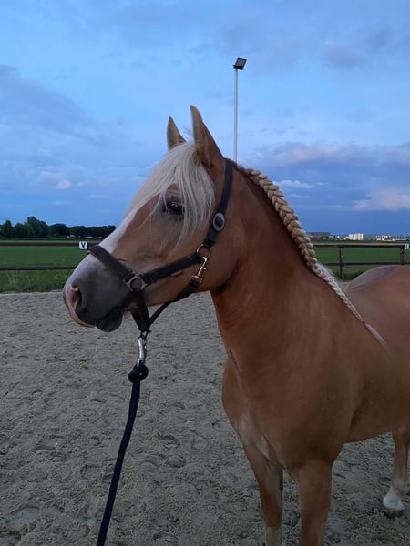 Bo is een ontzettend leuke en werkwillige pony met een sterke focus op haar baasje. Ze is sociaal en staat braaf in een kudde met andere paarden, maar kan ook prima alleen staan, mits ze andere paarden of pony’s in de buurt of in het zicht heeft. Voorheen stond ze overdag buiten en ’s nachts op stal, maar inmiddels staat ze 24/7 buiten en dat gaat haar uitstekend af. Onder het zadel is Bo veelzijdig. Ze kan springen tot ongeveer 80 cm en met goede begeleiding van de ruiter is hier zeker nog verdere groei in mogelijk. Ook in de dressuur beheerst ze de basis goed. Hoewel ze nog nooit officieel een proef heeft gelopen, is duidelijk dat ze met de juiste begeleiding verder ontwikkeld kan worden naar een hoger niveau. Bo loopt momenteel zonder ijzers en haar hoeven slijten op een natuurlijke manier goed af. Een bezoek van de hoefsmid eens in de drie maanden is doorgaans voldoende. Ze heeft haar basisentingen gehad en heeft tot nu toe geen dierenarts nodig gehad voor blessures, zoals kreupelheid. In de omgang is Bo over het algemeen heel braaf. Ze komt rustig naar je toe en is fijn in de hand. Af en toe probeert ze een hapje gras mee te pakken, maar dit is eenvoudig te corrigeren. Tijdens het rijden is ze betrouwbaar en doet ze niets uit ondeugd; soms kan ze ergens van schrikken, maar ze is hier goed doorheen te rijden. Ze heeft een klein eigenwijs randje, maar dat maakt haar juist leuk zonder lastig te worden. Aan de hand loopt ze netjes over wegen met rustig verkeer. Ze is nog niet gewend aan druk stadsverkeer. Ik verkoop haar wegens minder tijd en verhuizing naar een stad voor een studie. Hierdoor is er te weinig aandacht voor haar en kan ik haar beter verkopen aan iemand die haar alle liefde en aandacht kan geven.