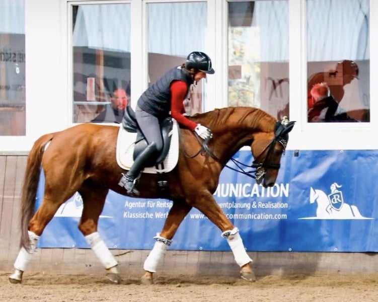 🐴 Bon Withro – Dressage Horse with an Exceptional Character and Sporting Quality We are offering the impressive dressage gelding Bon Withro, a horse that combines athletic performance with an outstanding temperament. An absolutely reliable partner for discerning riders who value quality, rideability, and future potential. Basic Data Name: Bon Withro Age: 10 years, gently and professionally backed at 4.5 years Height: approximately 16.1 hh Color: Chestnut Pedigree: Ben Kinsley × His Highness Pedigree & Bloodlines His sire, Ben Kinsley, is known for modern dressage horses with above-average movement quality, expression, and willingness to perform. His dam, His Highness, impresses with rideability, an excellent temperament, and her inheritance of reliability and strong character. Sporting Record - Successful in dressage competitions at A and L levels, with scores up to 7.9 - Winner at L level - M*-placed with scores up to 67%, achieving 2nd and 3rd place on the bit with scores up to 7.2 Temperament & Handling Bon Withro presents himself as a truly exceptional horse: - Extremely well-behaved, reliable, and fearless - Very easy to handle, even in daily interactions - Can be left alone in the stable without issues - Very social and compatible within the herd - Absolutely trailer- and load-trained, even when handled alone - Travel stress-free by trailer at any time - Routinely veterinary care in the last five years, including vaccinations Movement & Training - Elegant appearance with a sporty presence - Very good basic gaits with quality, rhythm, and expression - Always motivated, honest in work, and reliable in training Suitability A horse for ambitious amateurs and professionals with a view to further sporting development. Also ideally suited as a higher-level confidence-building partner for motivated young riders seeking a safe and willing partner. Health A veterinary certificate is available and can be provided upon request. 📍 Location: Hamminkeln, 46499 This extraordinary horse impresses with performance, character, and charisma. We look forward to your serious inquiry and are happy to provide further information, photos, or videos.