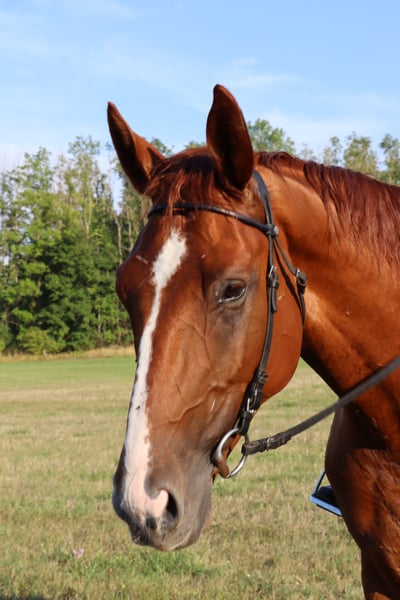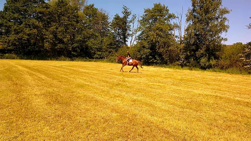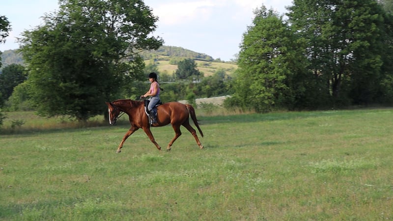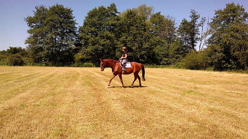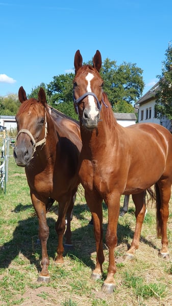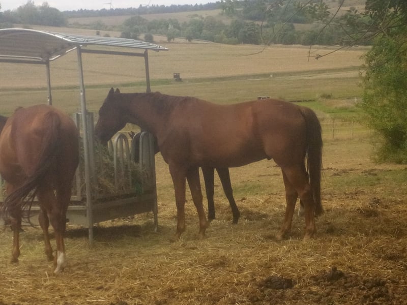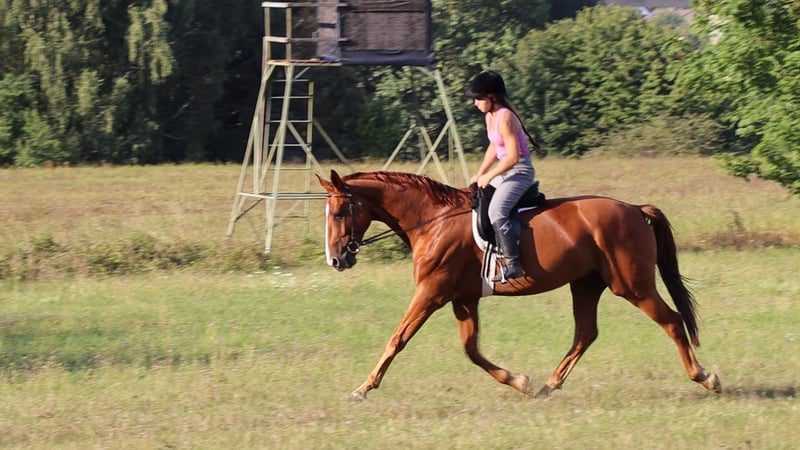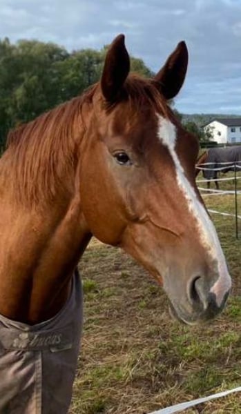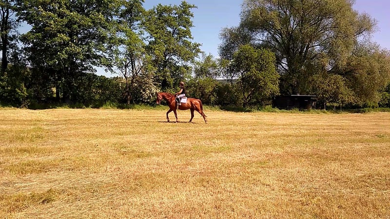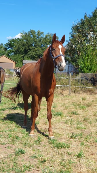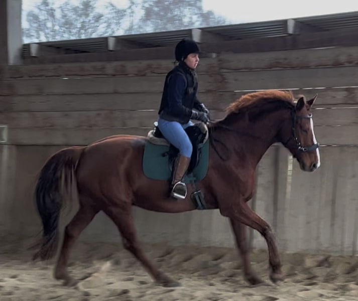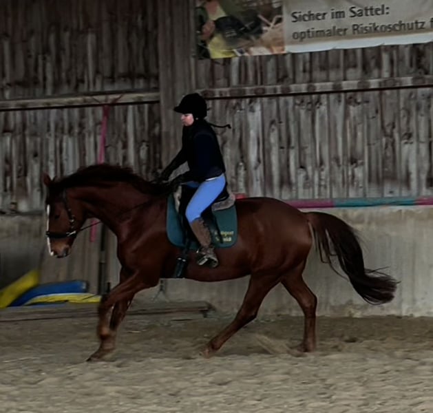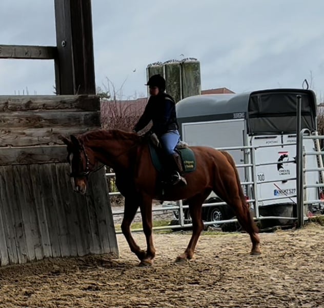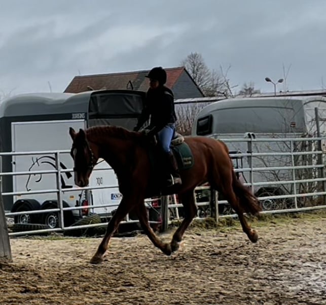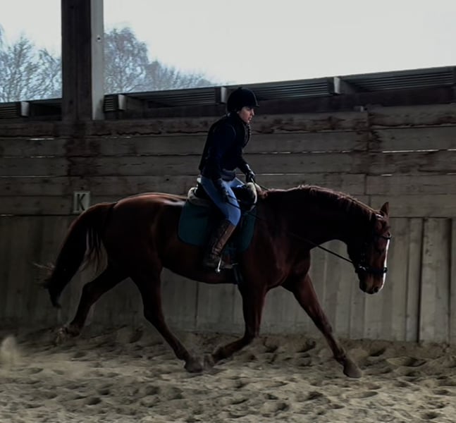 Hannoveraner Wallach, geb. 2016, Fuchs, mit einem Stockmaß von ca. 175 cm – ein eleganter und vielseitiger Freizeitpartner. Durch den langen, breiten Rücken (bei schmaler Brust und Schulter) und die große Aufwärtsgaloppade als Voltigierpferd denkbar. Dieser bildschöne Hannoveraner überzeugt durch sein sehr menschenbezogenes Wesen und seine hervorragenden Grundgangarten bei hoher Rittigkeit und ruhigem Temperament. Er ist bestens geeignet für abwechslungsreiche und sportliche Ausritte alleine oder in der Gruppe in vorderer oder hinterer Position sowie Dressur (modernes sensibles Maul, daher sollten ungeübtere oder härtere Reiter zum Sidepull greifen). Völlig entspannt sogar bei bellenden Hunden. Probeweise auf einem Turnier gewesen, wo er sehr brav war. Idealer Lehrmeister für klassisches, handunabhängiges Dressurreiten, da er viel verzeiht, aber dennoch rückmeldet. Hatte mit Außengalopp, Trab-Halten und einhändiger Zügelführung begonnen, aber aktuell wegen Erkrankung der Reiterin Fokus auf Gelände und Sitzlongen. Er hat Freude am Springen und eine gute Manier, aber dort wenig Mut, sodass er für das Springen einen sicheren Reiter benötigt. Bevorzugt Offenstallhaltung. Er kommt mit allen Pferden zurecht und schätzt viel Bewegung sowie Spielpartner, neigt nicht zu Verletzungen. Muskulär bedingtes Shivering hinten, welches mit Training und Geduld stetig besser wird. Trotz seines gutmütigen Charakters ist er ein Pferd und kein Fahrrad oder Sofa. Durch die großen Gänge fordert und fördert er die Fitness des Reiters, der bereit sein sollte, diese zu erwerben oder zu halten.