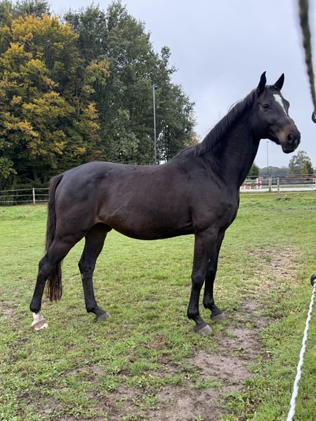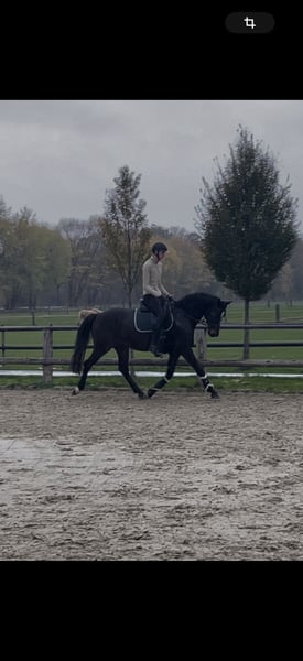 I am offering a 12-year-old Hanoverian gelding by Count Grannus. He began training at the age of 7.5, so his current level of education reflects that. He was trained and competed in jumping by a 14-year-old girl with a trainer. He has proven wins in E and A jumping classes. In 2024, he will be jumping his first L (large) classes, and in 2025, he achieved his first L placement. In training, he is now jumping the first fences in the next higher class. Canti has a lot of willingness to learn, ambition, and a good attitude. Unfortunately, as a young horse, he was kept alone in a box while other horses were outside. This situation has led him to be uncomfortable in confined spaces when alone. It is essential for him to be kept with other horses or to have them within his reach. In a box alone next to other horses, this is not an issue. He also needs a companion horse for trailer loading, as well as in smaller indoor arenas or stall corridors. Farrier visits are no problem. If you are interested, please feel free to contact me!