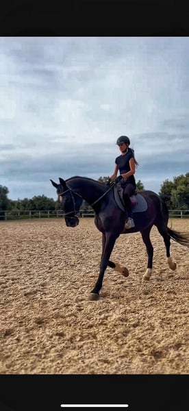 Rides out in the field twice a week. Has access to an arena and is started over 60 cm jumps.