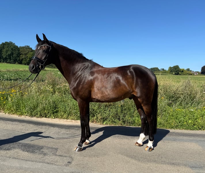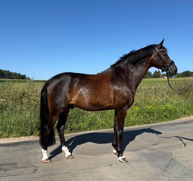 Unser 16-jähriger Wallach ist ein treuer Begleiter und echter Blickfang. Er bringt eine solide Grundausbildung mit – erste Erfahrungen in der L-Dressur und turniermäßige Starts bis A** im Springen – doch wir wünschen uns für ihn nun ein Zuhause, in dem er ganz im Freizeitbereich seinen Platz findet. Im Gelände zeigt er sich zuverlässig und gelassen, bei der Bodenarbeit ist er motiviert und arbeitet stets mit Freude mit. Er ist kein reines Anfängerpferd, dennoch unkompliziert im Umgang – mit etwas Erfahrung und einem sicheren Gefühl im Sattel lässt er sich sehr angenehm reiten. Besonders hervorzuheben ist, dass er auch mit Kindern gut zurechtkommt und sich freundlich und ausgeglichen zeigt. Da er für uns ein echtes Herzenspferd ist, geben wir ihn ausschließlich an Privatpersonen ab. Unser größter Wunsch ist ein liebevoller Endplatz, an dem er dauerhaft bleiben darf und als Freizeitpartner im Mittelpunkt steht. Video kann auf Anfrage verschickt werden. Bei Interesse freue ich mich über eine kurze Vorstellung der Person.