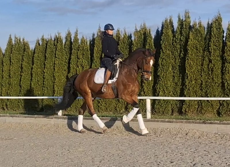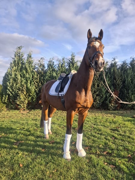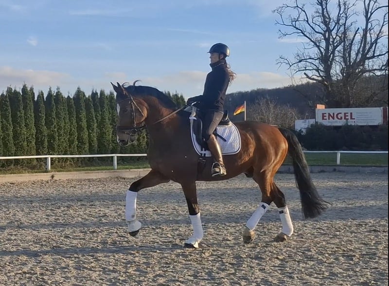 Casarotti ist ein 16-jähriger Wallach, der in seiner Jugend S-platziert (mit Profi) war und mehrere M-Prüfungen (mit Amateur) gewinnen konnte. In den letzten Jahren wurde er von zwei Amateuren (ü60) geritten. Dabei zeigte er sich stets lektionssicher (2er-Wechsel, Traversalen), jedoch gelegentlich etwas umweltorientiert. Daher suchen wir für ihn einen sicheren und sattelfesten Reiter, der ihn ruhig und konsequent begleitet. Führmaschine, Hängerfahren und Paddock meistert er problemlos, im täglichen Umgang ist er freundlich und zuverlässig. Aufgrund seines Alters sehen wir ihn nicht mehr als Turnierpferd für die hohen Klassen, sondern eher im ambitionierten Freizeitbereich mit gelegentlichen Starts in niedrigen bis mittleren Klassen. Aktuell ist er in Profi-Beritt und kann jederzeit probegeritten werden. In Kürze: * S-platziert, M siegreich, aktuell in Profi-Beritt. * Lektionssicher & zuverlässig im Umgang. * Etwas umweltorientiert → braucht sattelfesten, ruhigen Reiter. * Ideal als ambitioniertes Freizeitpferd mit kleinen Turnierambitionen.
