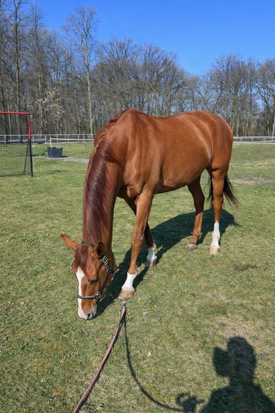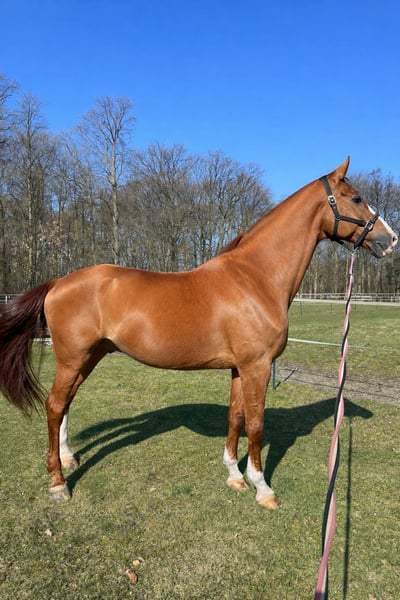 A beautiful, impressive 16-year-old gelding by White Star, approximately 179 cm tall. Unfortunately, due to time constraints, he is available for sale. We acquired this chestnut in 2021. He has successfully competed up to S*-dressage and has also earned some ribbons in M** level. The horse has issues with his right knee and fetlock joint. The right hind fetlock was flushed and treated in the Hanse Clinic at the end of 2024. There is a cartilage damage present. Arthrosis is also present in the right knee, but it has not caused any significant problems so far and was an incidental finding during lameness investigations. In 2024, he experienced intermittent, diffuse lameness episodes that appeared suddenly. This led to multiple examinations at the clinic, with the final diagnosis indicating cartilage damage in the fetlock joint. The cartilage injury is not reversible and can only be managed through regular treatment and good turnout conditions (avoiding hard surfaces). Movement is essential. However, there are no guarantees regarding how long the cartilage will hold. The horse also has a mild laryngeal hemiplegia, which has not caused any noticeable issues or limitations so far. Depending on his housing, he may be more or less energetic. These conditions were known at the time of purchase. He is a lovable, sensitive, and playful type who also enjoys lunging and performing tricks in the round pen. Not suitable for beginners or as a school horse. Intended for experienced riders who have the time and joy to work with a sensitive horse and can handle his particular needs. Currently, he is being ridden, lunged, and trained on the lunge line. He is regularly exercised and is in normal work according to the veterinarian. He is a good pasture companion but does not like flies very much. He is very social and playful. Only to good hands. Place before price. Further information will be provided upon genuine interest.