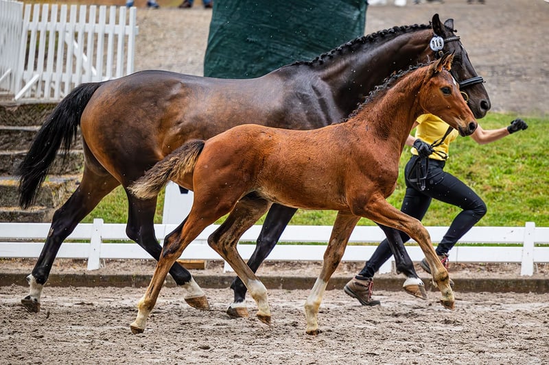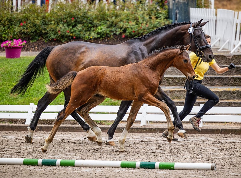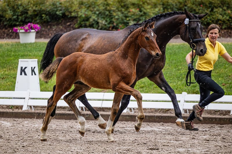 Schoko Santini ist ein typvoller Wallch, der sich mit viel Antritt und gut durch den Körper zu bewegen weiß. Schon als Fohlen erkennbar schön im bergauf konstruiert mit einer herrlichen Oberlinie. Schoki zeigt drei sehr gute Grundgangarten und weiß sich zu präsentieren, ist dabei aber sehr menschenbezogen und schmusig. Bei der Fohlenschau im Rahmen des Dressur im Park – Turniers Nörten-Hardenberg konnte er den 2. Platz belegen. Schoki wächst mit Familienanschluss auf. Regelmäßige Vorstellung beim Hufschmied und Entwurmen, Fohlenerziehung, Weide im Herdenverband, Licht, Luft und Bewegung sind bei uns selbstverständlich. Ebenso ein behutsames Absetzen, sowie ein pferdegerechter Umgang und eine nachhaltige Fohlenerziehung. Das letzte Jahr durfte er auf der Hengstweide genießen, wo er auch das Hänger fahren vorzüglich gelernt und gemeistert hat. Laut Zigeunermaß wird Schoki deutlich über 170 cm ... ohne Garantie natürlich. Segantini von Secret aus einer Fidermark-Mutter, ein bildschöner Hengst, herrlich bergauf konstruiert und mit viel natürlich Kadenz ausgestattet, war Prämienhengst der Hannoveraner Körung, Sieger seiner HLP in Adelheidsdorf mit einer Gesamtnote von 9,03 (Leistungsbereitschaft 10) und Bundeschampion der vierjärhigen Hengste 2022. Für die Rittigkeit gab es die Maximalnote 10, für alle anderen Kriterien durchweg die 9,0. Gesamt 9,2 Seit 2024 wird Segantini von Dorothee Schneider auf das große Viereck vorbereitet. Die Mutter Doriana ist mit drei sehr guten Grundgangarten, mit viel Schub aus der Hinterhand ausgestattet. Schon von naturaus zeigt sie sich immer geschlossen und tritt fantastisch unter den Schwerpunkt. Doriana hat einen hervorragendem Zug nach vorn, ist selbstbewusst und sensibel (aber nicht guckig). Ihre Stutenleistungsprüfung hat sie als fünftbeste mit einer Gesamtnote von 7,5 abgeschlossen. Dorianas Vater D-Online von De Niro war bis Intermediaire I erfolgreich und Vollbruder zu Anabell Balkenhols Dablino FRH, mit dem sie bei den Weltmeisterschaften und Olympischen Spielen startete. Mütterlicherseits geht es über Amie Petite auf die Halbblutstute Tulipe und weiter in 4. Generation auf Adlerbraut v. Adlersturm, die anlässlich der DLG-Ausstellung 1984 Siegerin der Eliteschau wurde, über die Staatsprämien-Stute Hessenperle, zur Stammstute Mandarine (Holst Stamm 5191).