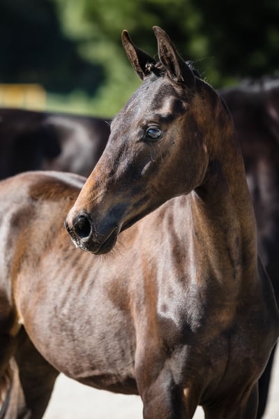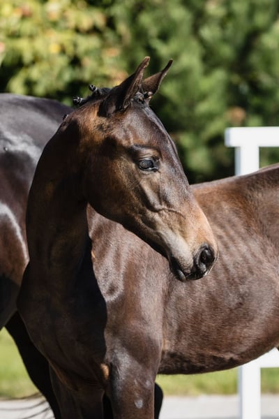 >> Despacito is a very typey, radiantly beautiful, and strong colt by fabulous Dynamic Dream to whom he bears extreme resemblance, and from great Hanoverian mare Diva Gora. His type, building, and foundation are great, his leg conformation is also correct. He beautifully engages his hind end. His nature is so ingenious, he is incredibly trusting and people-oriented, like all offspring from this mare. His pedigree includes many legends of dressage horses, such as his father, Westphalian stallion Dynamic Dream (won licensing in Westphalia, received premium scores 9.0s for trot and canter, 10.0s for willingness to perform, temperament, and character in Denmark), Don Federico, and Florestan. He will be able to compete on high level in dressage contests.