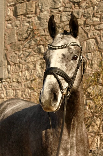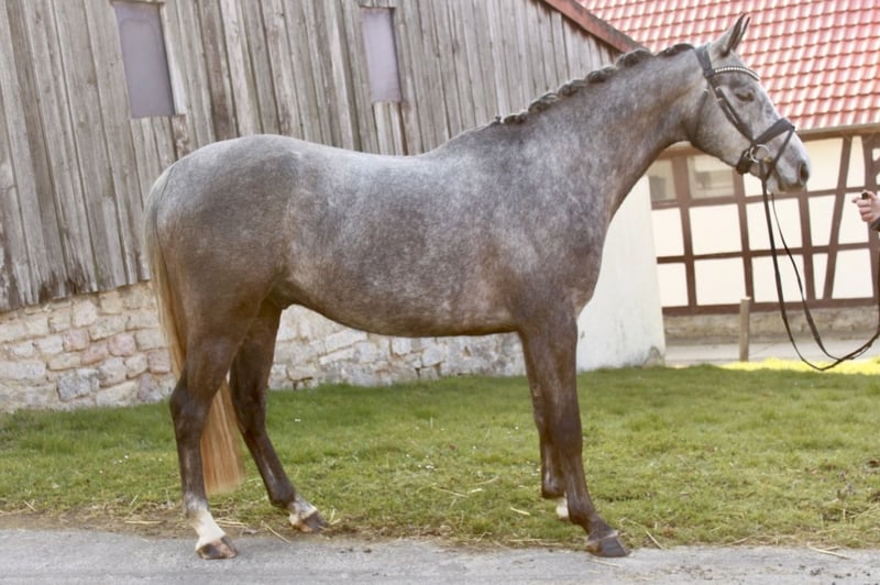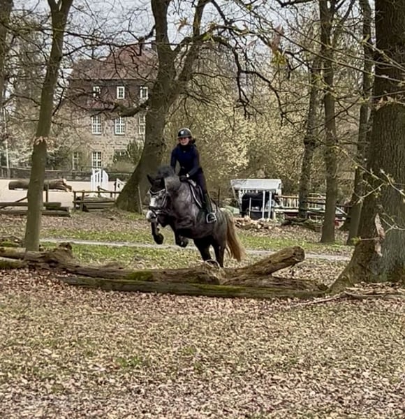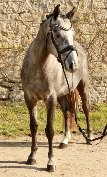 Unser vierjährige Wallach, Gerne Groß abstammend von Grey Top/ Stolzenberg ist ein ganz unkomplizierter, lustiger, kleiner Freund, der mit Talent am Sprung überzeugt. Im letzten Jar angeritten präsentiert er sich schon recht abgeklärt, aber sportlich ambitioniert. Neben der Dressurarbeit und dem Springen, sowie Freispringen kennt er schön Gelände und lässt sich auch von Kindern reiten und händeln. Im Umgang, mit anderen Pferden, beim Verladen, sowie beim Schmied ist er artig. Das Pferd hat noch keinen TÜV Umfassendes Videomaterial und weitere Infos gern unter 0174/5630008