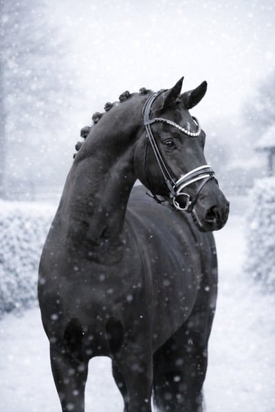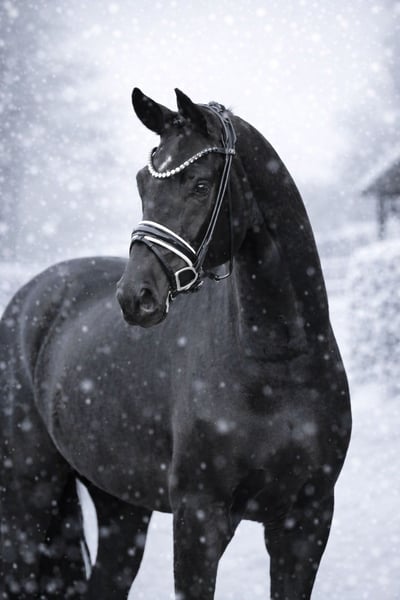 One of a kind! Jet-black top model with a “everybody’s darling” temperament and “bachelor” charm! Highly attractive dressage prospect with consistently high-quality training potential and excellent riding comfort. Standing tall with a modern, masculine type, yet long-legged and appealing in expression and presence. A wonderful young horse that brings daily joy. Good veterinary check.