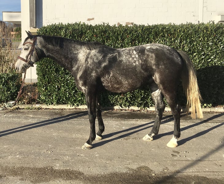 Bred at Gestüt Machbach until the age of 3. Very well-handled and human-oriented. Suitable for someone willing to give him a bit more time. He has a large, expressive canter but is not yet strong enough to maintain the gait consistently. This year, he has competed in Springpferde A* classes (7 rounds) and has already been placed with a score of 7.8. Under saddle, he can sometimes be a bit shy and needs a patient rider who can help him feel secure. Please feel free to contact us for further questions.