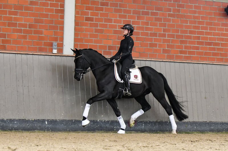 Mit dem fünfjährigen Hannoveraner Wallach SABINOS präsentiert sich ein lackschwarzer Charmeur mit großer Ausstrahlung, klarem Kopf und viel Herz, der direkt einsatzbereit ist. Er überzeugt mit einem angenehmen Go, hervorragender Arbeitseinstellung und dem Wunsch, seinem Reiter stets zu gefallen. Erste Lektionen wie Außengalopp meistert er spielend leicht, und seine drei qualitätsvollen Grundgangarten, natürliche Balance sowie erkennbare Versammlungsbereitschaft lassen sein großes Potenzial deutlich werden. Der Sohn von Schwarzgold aus einer Revolution-Mutter vereint moderne Dressurgenetik mit besten Reiteigenschaften und konnte sportlich bereits mit Siegen und Platzierungen in Reitpferdeprüfungen sowie hohen Platzierungen in Dressurpferdeprüfungen der Klasse A überzeugen. Sabinos absolviert seine Turnierstarts vom Verladen bis zur Prüfung souverän, gelassen und stets aufmerksam bei seinem Reiter. Im Umgang zeigt er sich freundlich, unkompliziert, menschenbezogen und absolut zuverlässig. Mit seiner hohen Grundqualität, Rittigkeit und seinem ausgeglichenen Charakter empfiehlt er sich als vielversprechender Partner für den gehobenen Dressursport ebenso wie als ideales Umsteiger-, Junioren- oder Damenreitpferd für den ambitionierten Freizeitsport. Anschauen und Ausprobieren ist nach Absprache jederzeit möglich.