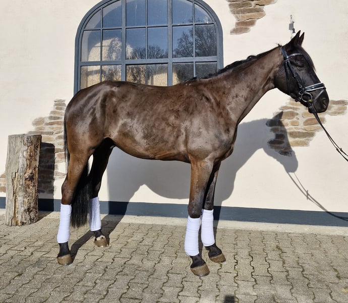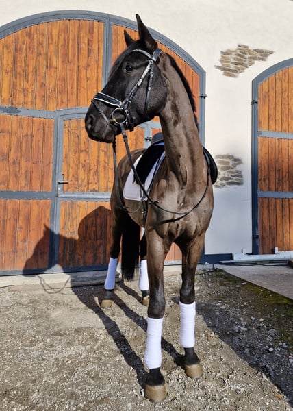 Zum Verkauf steht ein talentierter 5-jähriger Hannoveraner Wallach (geb. 2021), Rappe, E-fertig ausgebildet und mit viel Potenzial für den Dressursport bis A-Niveau. Besonders hervorzuheben ist sein ausdrucksstarker, schwungvoller Trab mit viel Raumgriff, der ihn für ambitionierte Reiter interessant macht. Abstammung: Vater: Apache – international bis Grand Prix erfolgreich, bekannt für Rittigkeit und Bewegungsqualität Mutter: Hauptstutbuch Verdena von San Amour aus einer Tochter von Sandro Hit Damit vereint er bedeutende Dressurvererber wie Apache, Gribaldi, San Amour und Sandro Hit in direkter Linie. Ausbildung & Training: Schonend angeritten im Herbst 2024 Weitergeritten bis Mai 2025, anschließend Weidepause Seit Oktober 2025 wieder im regelmäßigen Training Er kennt: Bodenarbeit Longieren Stangenarbeit Ausritte Er ist E-fertig ausgebildet und kann perspektivisch auch A-Turniere gehen. Er kennt bereits verschiedene Reitanlagen. Spaziergänge alleine meistert er problemlos, beim Alleinreiten benötigt er aktuell noch etwas Begleitung. Charakter: Ein sehr lieber, menschenbezogener und lernwilliger Wallach, der sich im täglichen Umgang unkompliziert zeigt. Gesundheit: TÜV ohne Befund regelmäßig geimpft und entwurmt schmiedefromm Besonderheiten: Stockmaß ca. 1,70 m, altersbedingt noch leicht im Wachstum Rappe, korrekt gebaut Besonders hervorzuheben ist sein starker, raumgreifender Trab Viel Potenzial für den Dressursport, auch als gehobenes Freizeitpferd interessant Videos: Aussagekräftige Videos vom Reiten und Longieren können bei Interesse gerne zugesendet werden. Probereiten: Nach Terminvereinbarung möglich. Für das Probereiten wird eine Gebühr von 30 € erhoben. Er wird nur in fördernde und wertschätzende Hände abgegeben.