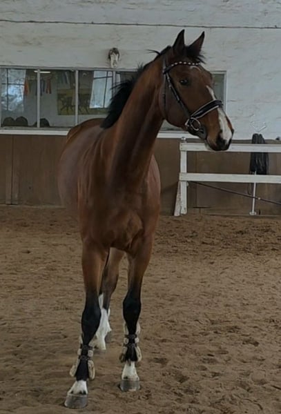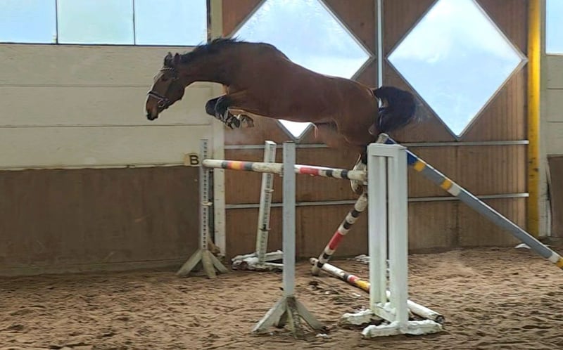 Five-year-old gelding by Grey Top – talented young horse with excellent character For sale is a 5-year-old gelding by Grey Top with top-class jumping pedigree. He is well-started and already shows great reliability under saddle. Gryffindor jumps small courses with ease, demonstrating lightness, caution, and excellent manners. He possesses a lot of scope and impresses with his overview and composure at the jump. He is also pleasant to ride in dressage, well-regulated, and consistently cooperative. Additionally, he remains calm and well-behaved in the field. In daily handling, he is very well-mannered, friendly, and uncomplicated. He gets along well with other horses, is easy to load and farrier-friendly. Thanks to his wonderful character, he is suitable both as a young prospect for show jumping and for ambitious leisure riders seeking an honest, talented horse. A recent clinical ultrasound and X-ray examination are available. A handsome, talented horse with great potential and an excellent temperament. 5-year-old Hanoverian gelding by Grey Top, 1.75 m (approx. 17.1 hh) Clinical ultrasound and X-ray reports available Video: https://youtu.be/o5Ni10fyCZ8?si=M_1gDtyBYa9ELRfm More photos, videos, and insights into our horses’ daily life can be found on Instagram: [maresi_lange]. Feel free to visit and get to know our four-legged friends beforehand. Additional horses are available on my website MaresiLange.de or upon request. Please note: The horse’s description is based on subjective impressions and experiences and does not constitute a guarantee of properties or qualities. Trial riding is at the buyer’s own risk. The sale is carried out on behalf of the owner. For the presentation and trial riding of the horse, we reserve the right to charge a fee of 30 euros, which will be deducted from the purchase price if the horse is sold.