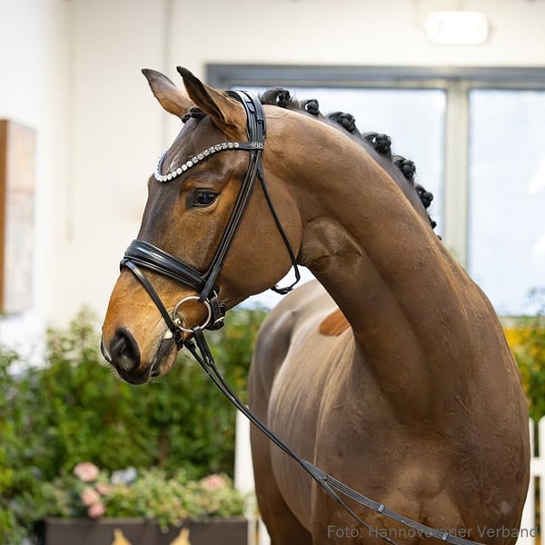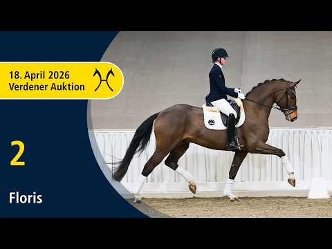 Das Pferd ist ein Verdener Auktionspferd und wird am 18.04.2026 onlive versteigert. Vom 6.04. bis zum 18.04. kann das Pferd jeden Tag beim öffentlichen Training besichtigt und ausprobiert werden. Das Startgebot bei der Versteigerung ist 8.000 Euro. Floris präsentiert sich elegant und mit außergewöhnlicher Bewegungsgüte. In ihm steckt großes Potenzial, das gezielt gefördert werden möchte. Mit seiner Reiterin Alexandra Eitenmüller ist er bereits siegreich und hochplatziert in Reitpferdeprüfungen und bestätigt damit die Qualität seines Mutterstamms. Dieser wird angeführt von Elvis VA v. Esprit, der mit Nadine Capellmann olympisches Mannschaftsgold gewann. Weiterer Erfolgsträger ist Cortney-Cox v. Carlo (international 1,60 m mit Pius Schwizer). Sportname: Floris 75 Sporterfolge: RPF: 1/1. 1/2. 1/w. 1. Generation Auktionspferde: Feodora v. For Romance I (FoVA 2019). 2. Generation Sportpferde Dressur: Scolari's Sixpack v. Scolari (DRE: S** mit Marie Leßnig); Saimir v. Scolari (DRE: M** mit Marco Bührig,VA 2020); Felicity Romance v. Fürst Romancier (DRE: M** mit Andrea Petit,VA 2017). Sportpferde Fahren: Galen V v. Grafenstolz (Fahren: int. S mit Laura Philippot). Auktionspferde: Sunseeker/St. Elmos Fire v. Scolari (VA 2018,VA 2021). Bes. Prämientöchter: HannPr Shenandoah v. Scolari. 3. Generation Sportpferde Springen: Grosso 22 v. Graf Top (SPR: 1,45 m mit Nico Sauer); Gallardo 6 v. Graf Top (SPR: 1,30 m mit Tobias Heß); Grandorin Gan v. Graf Top (SPR: 1,30 m mit Nina Heiß). Aufbauprüfungen Dressur: Daria Devine v. Danone I (DRE: L); Diamond's Diva 3 v. Diamond Hit (DRE: L). Aufbauprüfungen Springen: Deep Horizon v. Diacontinus (SPR: L); Daenerys Targaryen v. Diacontinus (SPR: L). 4. Generation Sportpferde Dressur: Simply Magic 4 v. Stedinger (DRE: S* mit Melanie Kleyer); Liander K v. Lingh (DRE: M** mit Vivian Pfoh); Salt Lake 6 v. Stedinger (DRE: M* mit Jürgen Sauerteig,FoVA 2006). Sportpferde Springen: Cadence 11 v. Cristallo I (SPR: 1,35 m mit Denis Nielsen); gek. Hengst Curo v. Cornado I (SPR: 1,35 m mit Sarah Ander,Vechta 2011); Little Esprit v. Espri (SPR: 1,40 m mit Thomas Jahn); Jona I/Classic Dakota v. Casallco (SPR: 1,50 m mit Martinez Bastida Mariano,CSI3* - GOLD 4 - GRAND PRIX 2025); gek. Hengst Visano/v. Van Gogh v. Van Gogh (SPR: 1,40 m mit Maximilian Ertz,Verden 2019,HM 2019); Czwerg v. Clinton (SPR: 1,40 m mit Henry Stude); Chacca Blue v. Chacco-Blue (SPR: 1,40 m mit Rick Siewert); Utendro v. Uccello (SPR: 1,35 m mit Florian Karns); gek. Hengst C-Mocca D`Or/C-Mocca D'Or v. Monte Bellini (SPR: 1,35 m mit Sven Göller,Verden 2012,HM 2012,Prä.Spr. Körung Verden 2012); VbPr Padelli v. Padarco van het Hertsfeld (SPR: 1,35 m mit Katharina Oestreich); Elaxy v. Espri (SPR: 1,35 m mit Caroline Koller); gek. Hengst Viviaro v. Van Gogh (SPR: 1,30 m mit Jochen Fromberger,Verden 2020,HM 2020); Pippa/Pippadelli v. Padarco van het Hertsfeld (SPR: 1,30 m mit Katharina Oestreich); Little Eddy v. Espri (SPR: 1,30 m mit Thomas Jahn); Strolch 238 v. Silvio I (SPR: 1,30 m mit Marcel Schneider); Chassi v. Chasseur I (SPR: 1,30 m mit Alexander Geiss,Springpferdeprüfung -international- 2008). Aufbauprüfungen Dressur: gek. Hengst Viva las Vegas RS/Viva las Vegas 9 v. Viva Gold (DRE: int. L,Hoftermin 2024,FoVA 2020: 20.500 €); gek. Hengst Wyclef Jones/v. Weltmeyer v. Weltmeyer (DRE: L,Bundeschampionat f.Reitpferde m.M. 2003,Championat für Reitpferde o.M. 2003,Verden 2001,HM 2001: 57.500 €). Aufbauprüfungen Springen: Diaz 11 v. Diarado (SPR: 1,30 m mit Josch Löhden); StPr Sieglinde/Sieglinde 20 v. Silvio I (SPR: 1,30 m mit Jörn Kusel); gek. Hengst Galino/Galino 27 v. Graf Grannus (SPR: M mit Hess,Christian,Verden 2000,HM 2000); Vollcool v. Van Gogh (SPR: L); Calupia-W v. Hickstead White (SPR: L); Pretty Woman 219 v. Padarco van het Hertsfeld (SPR: L). gekörte Hengste: gek. Hengst Diaro Gin/v. Diacontinus v. Diacontinus (Verden 2016,HM 2016: 65.000 €,Prä.Spr. Körung Verden 2016); gek. Hengst Frisantos/v. Franziskus v. Franziskus (Verden 2016,HM 2016: 75.000 €); gek. Hengst v. Don Index (Redefin 2014); gek. Hengst v. Clinton v. Clinton (Verden 2011,HM 2011); gek. Hengst v. Rousseau (ex: Rambo) (Verden 2008); gek. Hengst Glenn Miller/GLENN MILLER P v. Gardeulan I (Verden 1987,VA 1989). Auktionspferde: Vinted SN/Vinted v. V-Power (FoVA 2024); Vaiana v. Va Bene (FoVA 2023); Temptation Love v. Total Diamond PS (FoVA 2022); Bronx v. Bonds (FoVA 2022); Balou Check v. Balou du Rouet (VA 2024); Grey Fantasy v. Grey Flanell (FoVA 2017: 19.000 €); Grey Fantastic v. Grey Flanell (FoVA 2016: 37.000 €); Franz Josef Strauß v. Foundation (FoVA 2015); Flash Dancer v. Fidertanz (FoVA 2013); Seute Deern v. Stolzenberg (VA 2016); Damian v. Don Index (FoVA 2012); Dorum's Liebste/Despina 50 v. Desperados (VA 2014); Feuer und Flamme 3 v. Feuerspiel (FoVA 2011); v. Stedinger v. Stedinger (VA 2011); Rock'n Roll P v. Rousseau (ex: Rambo) (FoVA 2005); Carla v. Chasseur I (VA 2007); Charleen v. Chasseur I (FoVA 2002); Flora/Flora 120 v. Fleetwood (VA 2000); Rivalin 40 v. Rio Branco (VA 1996). Bes. Prämientöchter: StPr Calido's Beste v. Calido I; StPr Silvia v. Silvio I; StPr Deluxe P./Deluxe P v. Dacaprio; StPr Elli v. Espri; StPr Esprina v. Espri; StPr Laura P v. Lauries Crusador. 5. Generation Sportpferde Dressur: Elvis VA v. Espri (DRE: int. Grand Prix mit Nadine Capellmann,Grand Prix Kür -Weltcup- Qualifikation -international- 2012,World Dressage Masters 2012,Grand Prix Kür -international- 2012,World Dressage Masters 2012,Grand Prix Kür -international- 2012,Grand Prix Kür -international- 2012,Grand Prix Special -international- 2012,Grand Prix -international- 2012,Grand Prix Kür -international- 2012,Grand Prix Kür -Weltcup- Qualifikation -international- 2011,Grand Prix Kür -international- 2011,GP - Grand Prix 2011,GP - Grand Prix 2011,Grand Prix Kür -international- 2011,Grand Prix Kür -Weltcup- Qualifikation -international- 2011,Grand Prix Special -international- 2011,Gr