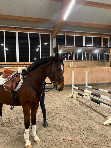 Hübscher 4 jähriger angerittener Hannoveraner Wallach von Carridam x Ricardo Z aus eigener Zucht sucht ein tolles neues Zuhause. Ideal für Junioren oder Reiter, die es leicht mögen. Er freundlich , aufgeschlossen und menschenbezogen. Er ist seit November 2025 in Ausbildung, lernt schnell und ist unkompliziert. Er ist leicht in der Anlehnung, fleißig und reagiert gut auf Stimme. Er kennt Führanlage, Doppellonge und auch schon kleine Runde draußen. Er ist freigesprungen und macht es mit Ruhe und Übersicht. Er ist herdenverträglich, unkompliziert und unerschrocken. Er kennt Schmied, Verladen, Tierarzt. Natürlich wurde er regelmäßig entwurmt, geimpft und die Zähne kontrolliert. Wir glauben, dass er ein toller Partner ist im Springen, Vielseitigkeit und auch Dressur, am besten für einen mittelgroßen Reiter. Aktuell ist er ca. 160 cm Stockmass, er deckt aufgrund seines Exterieurs gut ab. Leider müssen wir uns mangels Zeit von ihm trennen. Seine 5j Schwester ist charakterlich auch sehr unkompliziert, hatte 2025 auf Anhieb geländepferde E den 2. Platz und A gewonnen . Nur in gute Hände abzugeben!