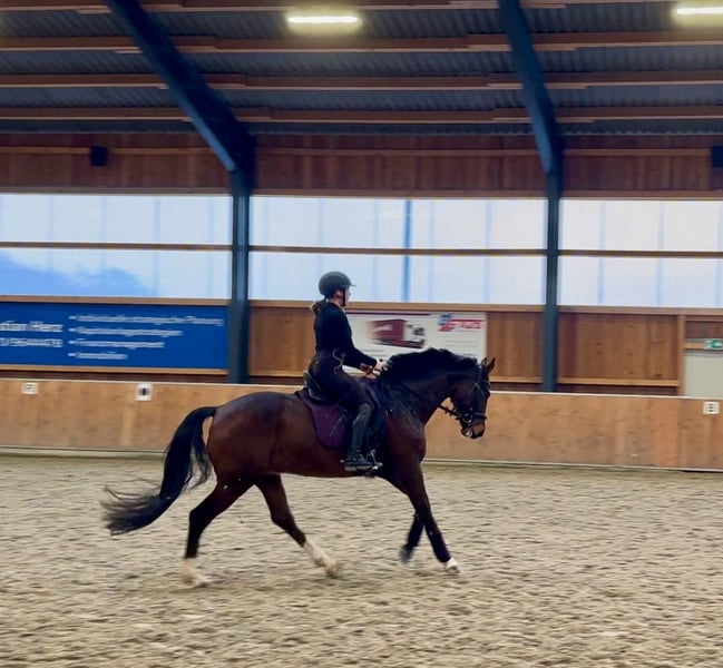 Dancier Gold x Franziskus Dieser bildschöne Wallach vereint alles, was sich ambitionierte Reiter/innen wünschen: brav, unerschrocken und im Umgang absolut unkompliziert - dabei jedoch mit genügend GO Einstellung und dem gewissen Funken "Elektrizität". Sowohl im Dressurviereck als auch am Sprung macht er ein sehr gutes Bild. Er überzeugt mit Qualität, Rittigkeit und Freude an der Arbeit und zeigt damit eine vielversprechende vielseitige Veranlagung. Durch seine natürliche Ruhe und Gelassenheit bringt er zudem ideale Voraussetzungen für den Hunter Springsport mit. Komplett unkompliziert in allem - ob im täglichen Umgang, beim Verladen, oder auf fremden Plätzen - er macht es seinem Reiter stets leicht. Ende 3jährig wurde er schonend angeritten und wird aktuell regelmäßig 3 -4 x pro Woche gearbeitet. Außerdem kennt er es im Herdenverband auf der Weide zu stehen - beste Voraussetzungen für ein ausgeglichenes und gesundes Pferd. Er kommt direkt aus Züchterhand und ist dort sehr umsorgt und behütet aufgewachsen. Auf den aktuellen Videos läuft er noch ohne Eisen. Video Dressur https://youtu.be/klsvbqOWgJk?si=u_SpKGThrCBUwCYt Video Springen https://youtu.be/-rufzvYu_Ec?si=VTH1pnLA6BwQdXzI Guter TÜV liegt vor.
