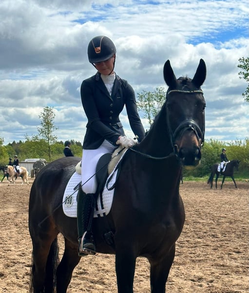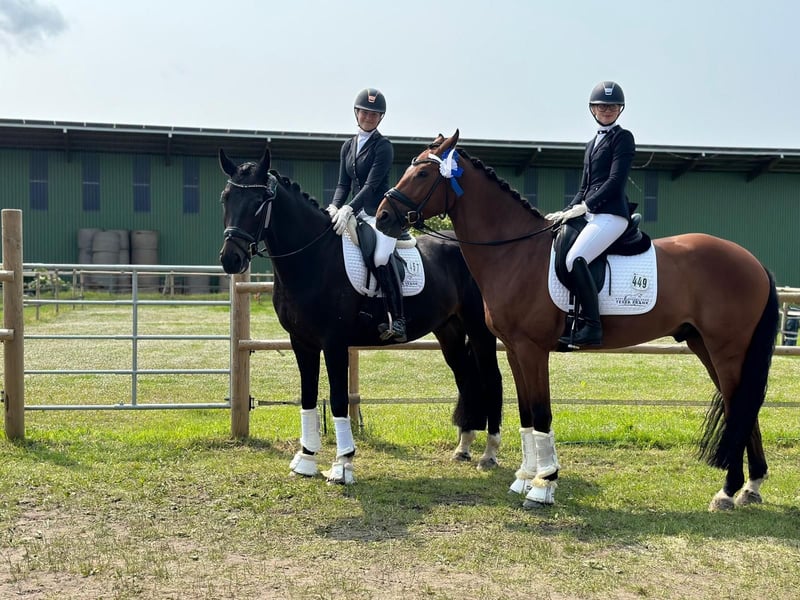 Elegant Hanoverian gelding with excellent basic gaits and a wonderfully gentle nature. We are offering a beautiful black-brown Hanoverian gelding with a height of approximately 16.1 hands. The gelding impresses not only with his quality of movement and expressive trot but also with his exceptionally friendly, calm temperament—whether at home or at competitions—and his outstanding work ethic. He has already been placed multiple times in dressage competitions at levels A and L. Currently, he is on his way to the M level (beginning to perform changes and traverses). He demonstrates intelligence and a willingness to learn. I wish for him a wonderful, new, and appreciative home with a family environment. He is being offered only due to personal reasons. To prevent riding tourism, we charge a fee of €40, which will be refunded upon purchase. If you are interested or need more information, I look forward to hearing from you via the contact form. I will get back to you promptly.