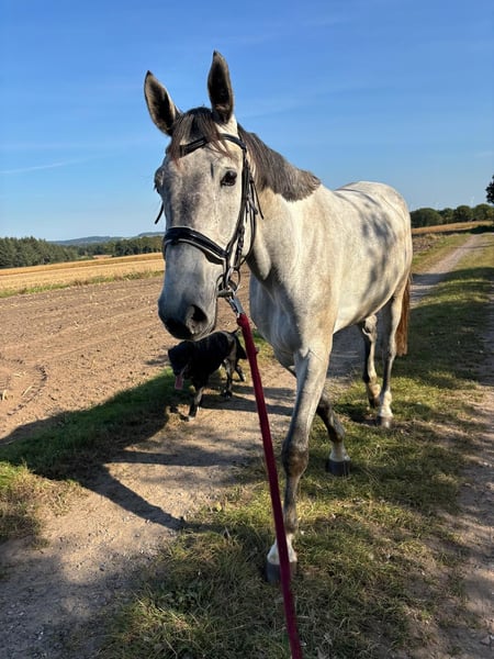 Beautiful Hanoverian gelding for sale – perfect for leisure and hobby riding! This elegant, tall gray from 2020 impresses with its friendly nature. The gelding is very gentle to handle, is familiar with tractors, cars, and dogs, and remains relaxed in all situations. His pleasant demeanor makes him a loyal companion for hack outings, walks, and relaxed hours in the countryside. He has been trained according to his age, but due to a veterinary diagnosis of the central phalanx, he is not suitable for sport. Therefore, I am ideally looking for a companion or a home with very light, gentle use. If you are interested or have further questions, please feel free to contact me. A viewing can be arranged by appointment.
