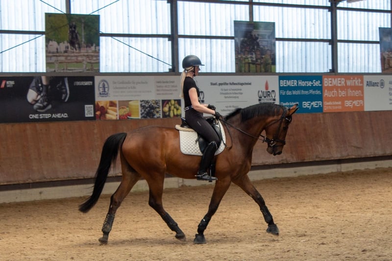 ***Anfragen gerne per WhatsApp an 0176 20286317 oder 0176 20286317*** Feel Good ist ein braver Wallach mit drei sehr guten GGA. Besonders hervorzuheben sind der Schritt und der Galopp. Er ist sehr menschenbezogen, brav im Umgang und beim Reiten. Im letzten Jahr ist er aufgrund von Wachstum schonend geritten und ausgebildet worden. Aussengalopp und Kurzkehrt klappen schon sehr gut. Mit den Seitengängen wurde spielerisch begonnen. Feel Good ist verträglich mit anderen Pferden, geht täglich in der Gruppe raus und ist vorne beschlagen.
