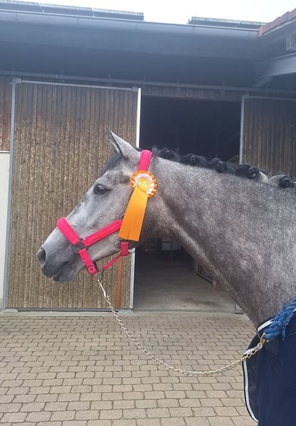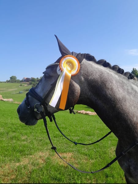Kano is an absolute dream horse. He leaves nothing to be desired. I purchased Kano as a foal and have ridden him myself. He is now 6 years old and appropriately trained for his age. He has never had any negative experiences and is a completely reliable partner. Last year, he was a top performer in Dressage Horse Class A, consistently earning ribbons and never returning from a competition without a prize. With scores up to 8.7, he often secured victory. We have casually started working on the exercises of class L, and Kano was able to place 4th in his very first Dressage Horse L test. He impresses with his expressive trot, always secure and large steps with plenty of overreach, and the well-known extended canter. But he is not only a star in dressage. In show jumping, he also shows great talent, although this has never been specifically trained, as I am solely a dressage rider. Kano is also a true treasure in handling. Whether hacking out, going for walks, hours of cuddling, or competing with beginners in their first riding or jumping competitions—he handles everything with ease. Perfect for everyone, whether competitive rider or beginner. Currently, no TÜV is available. For a trial ride, a fee of €40 is required, which will be credited towards the purchase if you decide to buy.