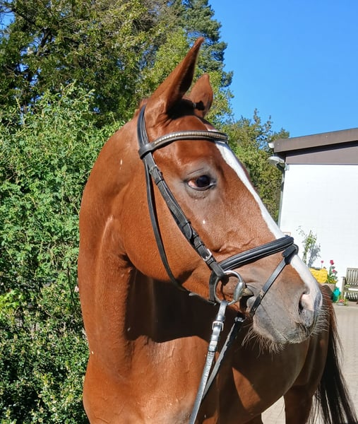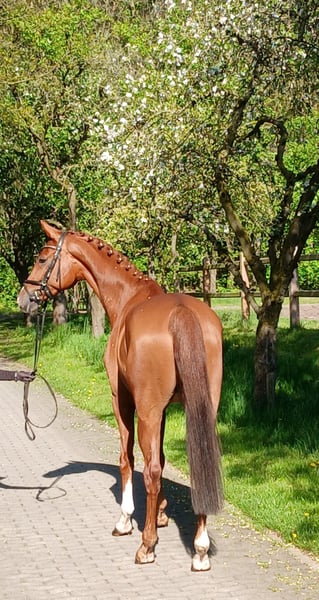 Tai is a very charming and friendly young horse. Bloodlines and very elegant. Gently backed and directly from the breeder, all doors are open to him. He is very comfortable and soft in the hand, always has a good forward movement, and is eager to work. He is also very easy to sit. We see him as a lovely horse for transitioning or for ladies. Since he is a bit more delicate and smaller, he was backed at the end of his fourth year. He has not yet been exposed to competition atmosphere. He enjoys hacking out, preferably in company. A very recent health certificate is available! Absolutely herd-proof. No prior health issues. Please call or message directly at 0172 8694703.