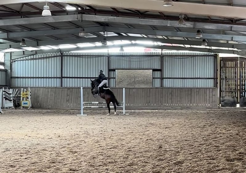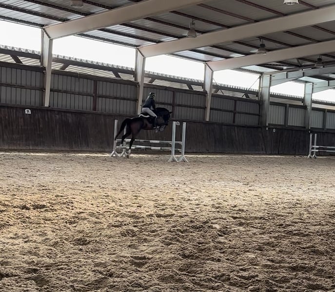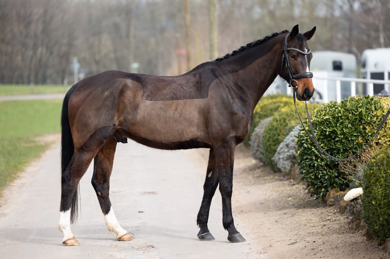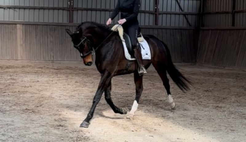 Finn, auch liebevoll Esel genannt, stammt aus unserer eigenen kleinen Zucht und ist bei uns im Offenstall aufgewachsen. Sein Name ist Programm, denn wenn man ihn auf seiner Seite hat, macht er alles für seinen Reiter. Er stammt ab von Foundation x Worldly I. Seine Vollgeschwister sind bis zur S Dressur erfolgreich und auch er bringt das nötige Talent und sehr gute Grundgangarten hierfür mit. In der Dressur ist er derzeit bis A/Anfang L ausgebildet und befindet sich weiterhin in Ausbildung. Finn hat viel Go, reagiert sehr fein auf die Hilfen und ist sehr weich im Maul. Auch am Sprung zeigt er viel Spaß und Talent. Er möchte immer auf die andere Seite, bringt hier allerdings ebenfalls ordentlich Go mit. Bisher wurde er von uns bis etwa A-Höhe gefördert. Ins Gelände gehen wir momentan immer mit einem erfahrenen Pferd mit. Hier zeigt er sich sehr entspannt, aber an manchen Tagen schreckhaft. Mehr als zur Seite hüpfen, macht er dabei nicht. Finn ist kein einfaches Pferd und wird daher ausdrücklich nicht als Anfänger-, Wiedereinsteiger- oder Kinderpferd abgegeben. Er braucht einen sicheren, fairen Reiter, der ihm klare Hilfen gibt und ihm besonders in neuen Situationen die nötige Sicherheit vermittelt, da er hier noch etwas nervös werden kann. Neben der Arbeit unter dem Sattel wurde Finn auch vielseitig vom Boden aus ausgebildet und reagiert dabei sehr fein auf Körpersprache. Besonders in der Freiheitsdressur und der Zirzensik zeigt er viel Freude und macht hier unglaublich viel Spaß. Platz vor Preis! Finn wird nur in allerbeste Hände abgegeben, wo er auch am liebsten wieder artgerecht in einem Offenstall stehen kann, da Boxenhaltung nichts für ihn ist.