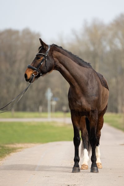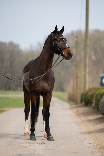 Finn, affectionately known as Donkey, comes from our own small breeding program and was raised in an open stable environment. His name is fitting, as he will do anything for his rider once he’s on your side. He is sired by Foundation x Worldly I. His full siblings are successful up to medium-level dressage, and he also possesses the talent and excellent basic gaits necessary for this discipline. He is currently trained up to A/early L level in dressage and continues to be in training. Finn has a lot of drive, responds very delicately to aids, and is very soft in the mouth. He also shows a lot of enthusiasm and talent over fences. He always wants to reach the other side and brings plenty of energy with him. So far, we have trained him up to approximately A-height. In the terrain, we usually ride him with an experienced horse. He is very relaxed here but can be somewhat spooky on certain days. He generally only jumps sideways in such situations. Finn is not an easy horse and is therefore explicitly not suitable for beginners, reiners, or children. He needs a confident, fair rider who gives clear aids and provides him with the necessary security, especially in new situations, as he can become a little nervous. In addition to work under saddle, Finn has also been extensively trained from the ground and reacts very delicately to body language. He particularly enjoys liberty dressage and equitation, showing a lot of joy and having an incredible amount of fun in these disciplines. Quality over price! Finn will only be placed in the very best hands, where he can live happily in a natural, open stable environment, as box stalls are not suitable for him.
