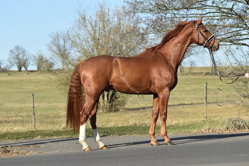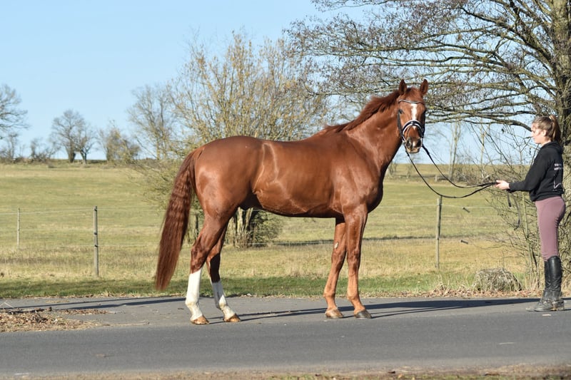 Fiete is a tall, yet compact chestnut gelding. He is easy to ride and has already been trained up to elementary level in dressage. The gelding is gentle in handling and suitable for anyone. If you'd like to get to know this wonderful dressage horse, please feel free to call us at 0170 8159909.