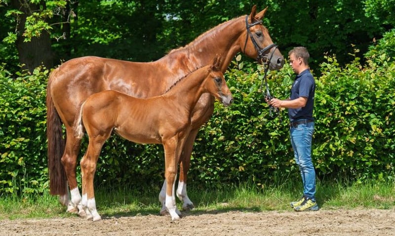Typical colt with proven lineage and a modern appearance. This charming and athletic dark chestnut with four white legs was born on April 4, 2025, and combines everything that makes a dressage rider's heart race in his pedigree. Fidertanz represents the modern dressage horse like few others: noble in type, clear in temperament, and high-class in movement. His offspring shine with above-average rideability, work ethic, and mental strength – often proven up to Grand Prix level. Maternal line: Rotspon – Belstaff – Ferro The maternal line of this foal guarantees balanced, performance-oriented riding horses with the best character: • Rotspon, a son of the legendary Rubinstein, is known for his particularly rideable and easily trainable offspring with a lot of heart, nerve strength, and excellent temperament. • Belstaff (by Brentano II) brings elegance and carrying power to the line – qualities that not only impress visually but also make a difference in riding. • Ferro, one of the most significant stallions in Dutch dressage breeding, adds expression, energy, and athletic toughness to the pedigree, always paired with a clear mind and willingness to perform. This pairing promises a highly rideable, reliable, and character-strong riding horse – with exactly the attitude that is so sought after in today’s dressage sport. A full brother of this foal is currently in stallion breeding, which speaks for the type, movement, and temperament of the pairing. A foal for the future – with a clear mind, great character, excellent lineage, and extraordinary development potential. Perfect for sport, breeding, or ambitious riders looking for a reliable dressage horse of tomorrow. We look forward to your inquiry.