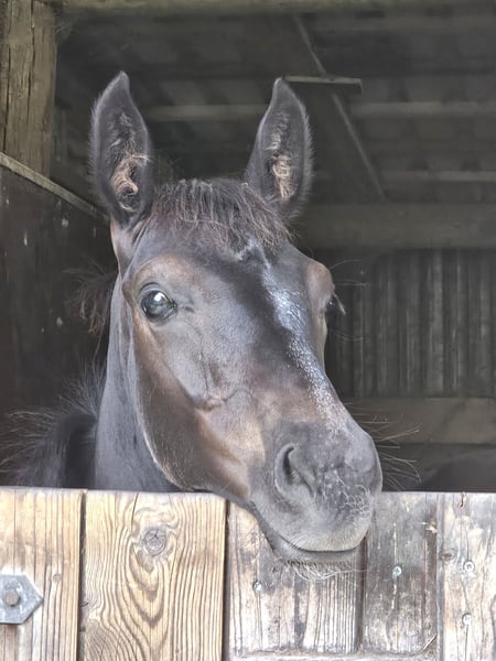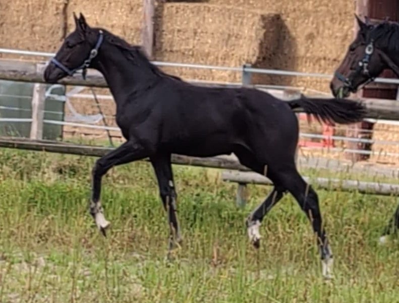 He was born on May 10th and already knows how to present himself. Not only is he very handsome, but he is also friendly towards people and loves to cuddle. The mother is a state premium mare, and the father has an excellent dressage pedigree.