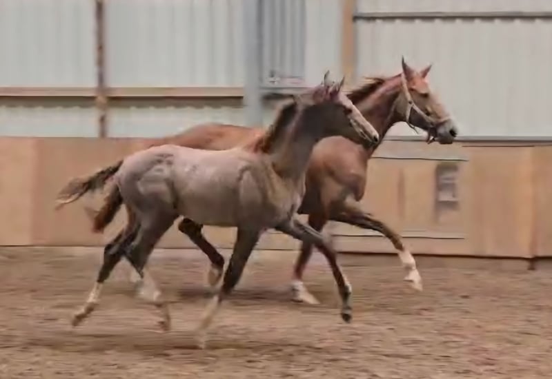Sehr schickes Hengstfohlen von Bloomingdale x Dancier X Bergkristall x Volturno. Der Hengst ist am 14.5 geboren und wird Schimmel werden. Er hat sehr gute GGA, wobei der Schritt besonders hervorzuheben ist, korrekt gebaut und hoch im Blut stehend. Seine Mutter ist Staatsprämienstute, Seriensiegerin in Reitpferdeprüfungen, selbst hoch platziert in Geländepferdeprüfungen, Springpferdeprüfungen und Springprüfungen der Klasse L und dazu noch Hengstmutter und Halbschwester von drei gekörten Hengsten. Die letzten Fotos zeigen die Mutter