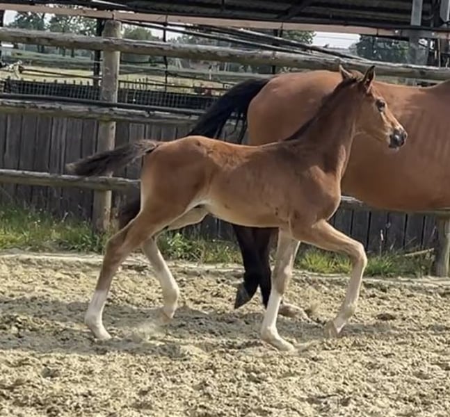 Erst am 08.06.25 geboren weiß er schon sich zu präsentieren. Ein Hengstfohlen von Sarai L x Spökenkieker x Baroncelli möchte in die selben Fußstapfen. Das sollte ihm gelingen.