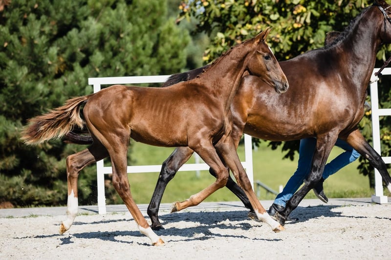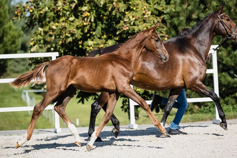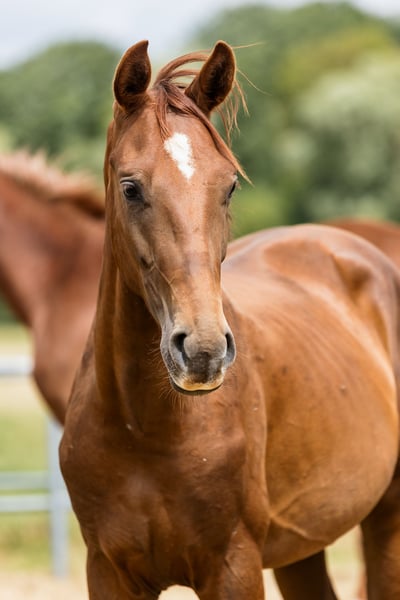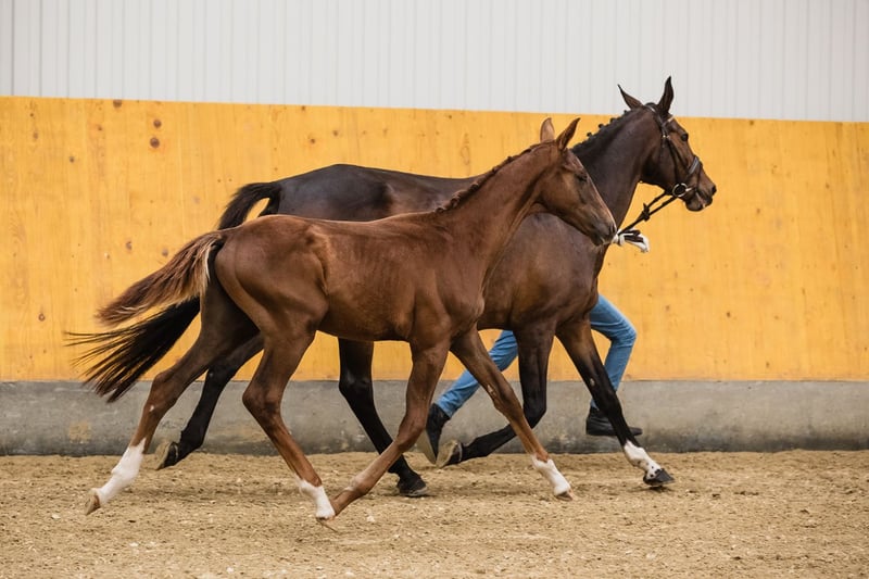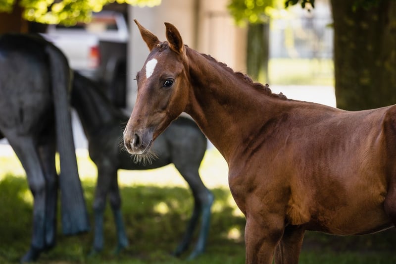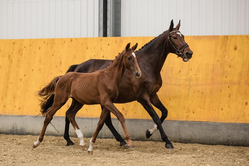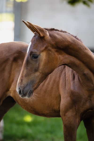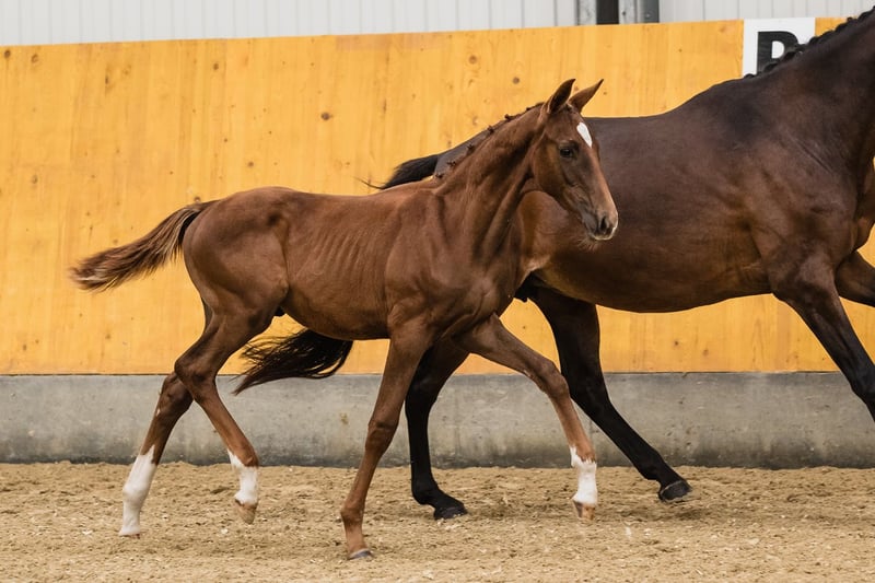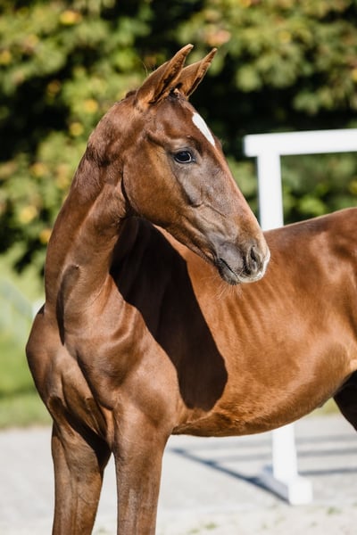 Vertigo is a son of fabulous stallion Va Bene and an amazing black mare Finchen. He is chestnut with a star on his beautiful head. He’s very typey and correct, and has long lines in his body. His movement is very dynamic and smooth, he engages his hind end well. His nature is so ingenious, he is incredibly trusting and people-oriented. He wants to work with people and you can see he enjoys it. Vertigo’s father, chestnut Va Bene, is a grandson of a famous Vitalis, known for incredible rideability and amazing movement, which all of his descendants inherit. Va Bene is a very relaxed horse with great mechanics, he has a huge amount of balance in all three basic gaits, which he displays in all performances under saddle. At the end of 2019, he completed a first-class 50-day test with the final score of 8.59 in Schlieckau and is now tested for life. His character showed a great willingness to perform and gave a strong overall impression, he received the grade 9.0. In an impressive year he was ranked second with the rideability 9.25. Va Bene was already victorious in ridden horse tests with top marks (including 9.5 for the canter). In 2021, Va Bene celebrated remarkable sporting successes! He was able to qualify for the 2nd World Championships in Warendorf and immediately for the Bundeschampionat.