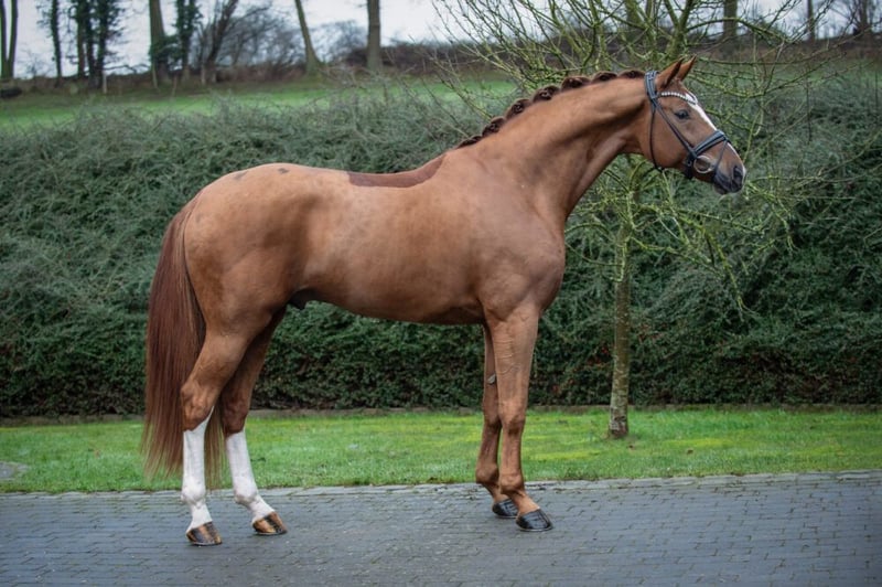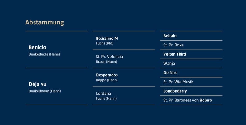 von Benicio – Desperados zugelassen für Hannover, Oldenburg und Westfalen WFFS frei Röntgenprotokoll unter www.hof-thelker.de Decktaxe: 300 € bei Besamung + 800 € bei Trächtigkeit am 45. Tag (zzgl. USt.) Jungzüchterrabatt! Züchtern bis 30 Jahre gewähren wir 30% Rabatt! Weitere Informationen bei Christian Thelker +49 175-854 3529 oder Karl-Heinz Hooghoff +49 170 4450576 „Ein Hengst mit bedeutendem Auftritt im Trabe und sehr schönem Überguss“ war der Kommentar des hannoverschen Zuchtleiters, Ulrich Hahne, auf der Körung in Verden. Diesen Eindruck konnte Beck’s FRH jährlich bestätigen! Mit seinen drei deutlich überdurchschnittlichen Grundgangarten, einem korrekten Fundament mit sehr guten Hufen, einem herrlichen Seitenbild und einer sehr positiven Arbeitseinstellung bei vorbildlichem Charakter, wusste er von Beginn an zu begeistern. Nach erfolgreicher Hengstleistungsprüfung startete Beck’s FRH unter dem Sattel von Thomas Schulze sportlich durch. Neben Siegen in Reit- und Dressurpferdeprüfungen platzierte sich Beck’s FRH 2022 im Hannoveraner Championat und vertrat die Hannoveraner Farben beim Bundeschampionat der 4-jährigen Hengste. Dort belegte er den 6. Platz. 2023 qualifizierten sich die Beiden auf Anhieb für das Bundeschampionat und wurden für die Weltmeisterschaften der jungen Dressurpferde in Ermelo/NED nominiert. Trab 9,0 Schritt. 8,8 Galopp 8,5 Durchlässigkeit 8,8 Gesamteindruck 9,0 Bei den Weltmeisterschaften der jungen Dressurpferde konnten Beck’s FRH und Thomas Schulze mit zwei überragenden Runden und Höchstnoten nicht nur das internationale Publikum begeistern, sondern auch die Richter zum Schwärmen bringen. Für den sehr aktiven und immer ausbalancierten Trab vergaben die Richter eine 9,0, 8,8 lautete die Note für den stets geregelten und mit viel Schulterfreiheit ausgestatteten Schritt, sein großzügiger Galopp wurde mit 8,5 bewertet, für seine beispiellose Durchlässigkeit, sein vorbildliches Seitenbild und die sehr gute Versammlungsbereitschaft wurde er mit einer 8,8 belohnt. Mit einer 9,0 für den Gesamteindruck führte dies zu 88,2 Punkten und sicherte Beck’s FRH und Thomas Schulze die Bronzemedaille im Klassement der 5-Jährigen. Auf Grund seiner sportlichen Erfolge wurde Beck’s anlässlich der Hannoveraner Körung 2023 der Namenszusatz FRH verliehen. Im Jahr 2024 konnte Beck´s seine erste Qualifikation zum Bundeschampionat auf Anhieb gewinnen. In Elmlohe war er mit 8,68 unangefochtener Sieger. Zu Pfingsten ging es dann nach Wiesbaden. Wir durften Beck´s beim Longines Pfingstturnier in einer internationalen Prüfung für 6-jährige Dressurpferde präsentieren. Vor der traumhaften Kulisse des Biebericher Schlosses konnte er sowohl in der Einlaufprüfung als auch im Finale überzeugen und jeweils den zweiten Platz belegen. 2025 gelang Beck’s FRH mühelos der Aufstieg in die schwere Klasse. Bereits bei seinem ersten Auftritt unter Ellen Richter überzeugte er mit Topnoten und einem zweiten Platz – und sicherte sich damit erneut die Qualifikation und Teilnahme am Bundeschampionat der Siebenjährigen Dressurpferde. Die Fohlen Seine Nachkommen zeichnen sich durch großzügige Bewegungen mit deutlicher Bergauftendenz aus. Auch seine sehr gute Oberlinie und das korrekte Fundament konnte er an seine Kinder weitergeben. Aus seinem ersten Jahrgang konnte er mit Beck’s in Black auf Anhieb einen gekörten Hengst in Verden stellen, der als Bronze Medaillengewinner auf dem Hannoveraner Championat sowie dem Bundeschampionat der 3 jährigen Hengste für Furore sorgen konnte. Auch aus seinem zweiten Jahrgang stellte Beck’s FRH auf der Hannoveraner Körung einen gekörten Sohn. Seine Fohlen konnten auf der heimischen Fohlenschau durchweg mit Bewegungsstärke und Präsenz beeindrucken. Benicio – der Vater Der Vater Benicio war 2011 Bundeschampion der sechsjährigen Dressurpferde und unter Jessica Lynn Thomas/SWE später bis Grand Prix siegreich. Dank seiner mehr als 30 gekörten Söhnen, Siegerstuten sowie sportlich und züchterisch erfolgreichen Nachkommen wurde der Belissimo M Sohn als Hannoveraner Hengst des Jahres 2025 ausgezeichnet. Déjà vu – die Mutter Die Zuchtleistung seiner Mutter „Déjà vu“ ist ebenfalls beachtlich, ihr erstes Fohlen Estero von Escolar nahm dreimal am Bundeschampionat teil und konnte sich 2019 an 4. Stelle im Finale der fünfjährigen Dressurpferde platzieren und ist inzwischen unter Shelly Francis Grand-Prix siegreich. Seine ein Jahr jüngere Vollschwester Et voila platzierte sich 2018 beim Bundeschampionat der 3-Jährigen Stuten und Wallache an 7. Stelle und platzierte sich bis zur schweren Klasse. Déjà vu‘s drittes Fohlen Ballance von Ballantines Finest qualifizierte sich für das deutsche Fohlenchampionat in Lienen. Dreijährig legte sie eine hervorragende SLP ab (Fremdreiter 10,0) und wurde mit der Hannoveraner Prämie ausgezeichnet. Déjà vu ´s viertes Fohlen ist Beck´s! 2025 wurde Déjà vu mit ihre Tochter Ballance und ihrer Enkeltochter als Elite-Familie ausgezeichnet und konnte auf der Herwart-von-der-Decken Schau in Verden das internationale Fachpublikum mit ihrer Bewegungsmechanik begeistern! Fazit nach 4 Fohlen: 2 gekörte Hengste, 1 Hannoveraner Prämienstute, insgesamt 5 Teilnahmen am Bundeschampionat, 3-erfolgreiche Dressurpferde, 1 Grand-Prix Pferd, 1 Bronzemedaille bei der WM.