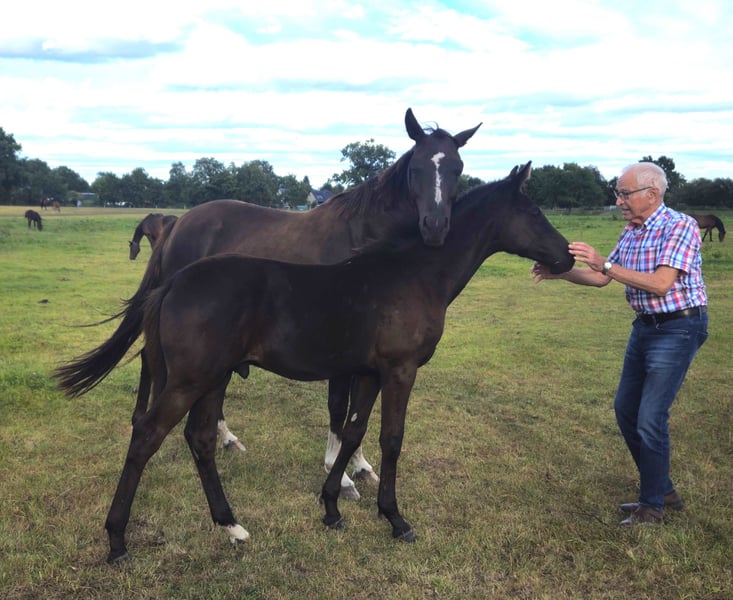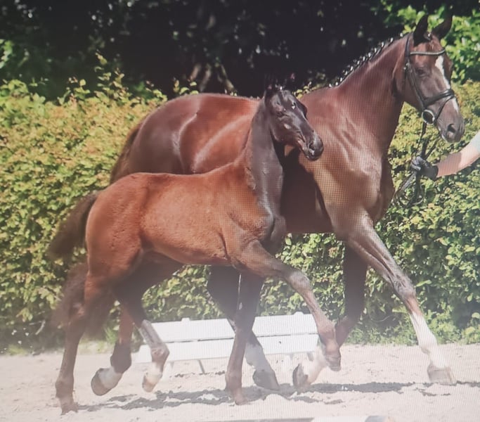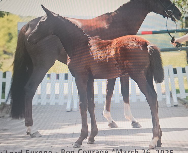 Zum Verkauf steht ein vielversprechender Sohn des Topvererbers Lord Europe aus einer leistungsgeprüften HannPrSt. von Bon Courage. Das Fohlen ist ein Ebenbild seines überaus erfolgreichen Vaters. Es verfügt über ein sehr gutes Fundament, sowie 3 gute, taktreine Grundgangarten aus einer aktiven Hinterhand. Seine mütterliche Abstammung läßt mit Bon Courage-Quaterback-De Niro dressurmäßig keine Wünsche offen. Im Umgang ist "Lord Courage" sehr unkompliziert, unerschrocken und menschenbezogen. Weitere Videos und Fotos schicke ich Interessenten gern per Whatsapp zu.