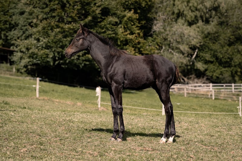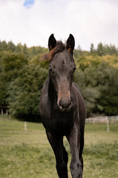 Zum Verkauf steht ein schwarzbraunes Hengstfohlen vom 01. Mai 2025. Der kleine Hengst überzeugt durch seine guten Grundgangarten, seine elegante Erscheinung und vor allem durch seinen außergewöhnlich lieben Charakter – beste Voraussetzungen, um sich später zu einem zuverlässigen und vielseitigen Reitpferd zu entwickeln. Sein Vater LeClerc verkörpert Eleganz und Ausdruck in besonderer Weise. Mit seiner großzügigen Silhouette, dem noblen Typ und den gleichmäßig sehr guten Grundgangarten hat er in kürzester Zeit auf sich aufmerksam gemacht. Besonders hervorzuheben ist sein wunderschönes Gesicht mit dem großen, ruhigen Auge, das Gelassenheit und Übersicht ausstrahlt – Eigenschaften, die er an seine Nachkommen weiterzugeben scheint. Die leistungsgeprüfte Mutter des Hengstfohlens stammt ab von Royal Blend x Prince Thatch xx x Werther. Muttervater Royal Blend vererbt sie zuverlässig einen besonders taktsicheren, klar durch den Körper schwingenden Schritt, der auch diesem Fohlen mitgegeben wurde. In Verbindung mit seinem liebenswerten Wesen und der Bewegungsqualität des Vaters entsteht ein Nachwuchspferd, das beste Perspektiven für die Zukunft bietet. Ideal als späteres Reitpferd – sowohl für den ambitionierten Freizeit- als auch den sportlich orientierten Reiter. Er wächst wie alle unsere Fohlen im Herdenverband mit weiteren Zuchtstuten samt Fohlen auf. Zurzeit genießt er seine artgerechte Aufzucht in bester Gesellschaft und kann ab Spätherbst in sein neues Zuhause umziehen.