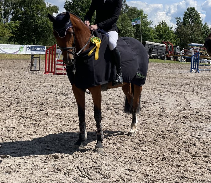 Ich verkaufe aus zeitlichen Gründen meine wunderschöne 10 jährige Hannoveraner Stute von Graf Top * Accord II. Ich habe sie Anfang 2024 direkt von ihrem Züchter gekauft. Aus ihrem Mutterstamm geht eine Halbschwester hervor, die unter Pius Schwitzer erfolgreich war. Als ich meine Stute gekauft habe war sie noch relativ grün und konnte durch einen Amateur weiter für mich ausgebildet werden. Sie ist 2024 dann eine tolle Saison unter diesem gelaufen, hat A** und L springen gewonnen und in jedem Springen eine Platzierung erreicht. Gleichzeitig hat sie mit mir als Springanfänger artig ein paar kleine Sprünge für den Einstieg zu Hause gemacht. 2025 konnte ich ihr leider aus privaten Gründen keine Turniersaison ermöglichen. Sie hat unheimlich viel Spaß am Springen, ist nicht glotzig am Sprung und möchte selbst mit einem Springanfänger immer auf die andere Seite. Sie ist sehr leichtrittig, brav und hat kein stutiges Verhalten. Sie möchte dem Reiter steht’s gefallen und erfreut sich an der täglichen Arbeit, egal ob Reiten, Springen, Gelände oder Doppellonge. Ich kann sie mir daher auch für jüngere Reiter oder Amazonen gut vorstellen. Sie ist geländesicher, Schmiede- und verladefromm und auch auf dem Turnier sehr artig gewesen. Sie kommt jeden Tag auf ihren Paddock und ist über Nacht in einer Box. Bei ihrem Züchter stand sie vorher immer in einer großen Herde und ist verträglich mit anderen Pferden. Ich suche ein schönes und liebevolles zu Hause für sie. Platz vor Preis. Ich verkaufe nicht an Händler. Sie kann gerne ausprobiert werden. Für das Probereiten nehme ich 35€, um dem Reittourismus vorzubeugen. Selbstverständlich wird dies beim Kauf verrechnet. Röntgenbilder liegen aus 2023 vor von meinem Kauf. Aktuellere Bilder müssten selber gemacht werden. Weitere Fotos oder Turnier- und Trainingsvideos auf Anfrage. Bei Interesse gerne eine Nachricht per Mail.