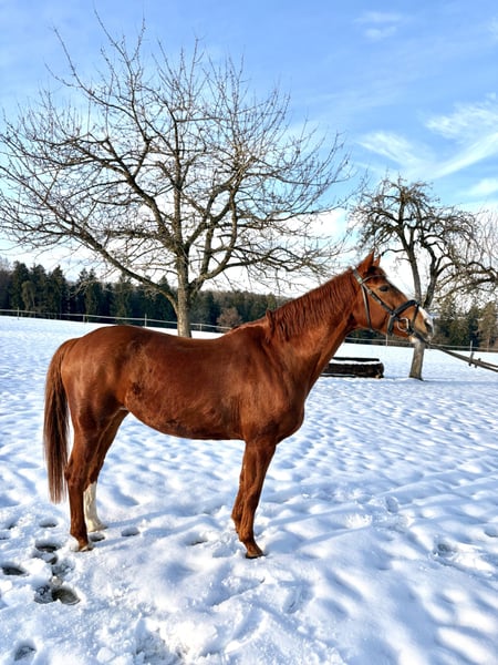 We are selling our well-behaved mare due to lack of time. Embassina is healthy, athletic, and currently underchallenged :) She is a 10-year-old Hanoverian mare, currently competing at A-level, and has participated in several small competitions. At six years old, she competed in L-level eventing but was not further trained in that discipline. Last year, she had a wonderful foal and has proven to be an excellent broodmare and mother. Recently, she has been ridden extensively in lessons and taken on trail rides with young riders. She is very reliable, motivated, and always manageable. We see her as an ideal partner for ambitious leisure riders who enjoy trail riding and dressage. Unfortunately, she is less enthusiastic about jumping and can get stressed in that discipline. She loves cross-country jumping and free jumping, which she does confidently. She is very well-behaved away from home, easy to load and farrier-friendly, and very friendly and gentle in handling. She is shod four times a year, has excellent hooves, and generally good health. She appears healthy and well-rounded on hay, straw, and mineral feed. Currently, she stays in an indoor box at night and is turned out in a mixed group during the day. We could also consider a quiet pasture with a run-in shed, provided she has a comfortable resting place. This is a truly lovely, sweet dream horse, and we are reluctant to part with her :) There are two minor issues: she tends to crib in her box (which does not affect her health) and has a sarcoid, which does not impair her and causes no problems.