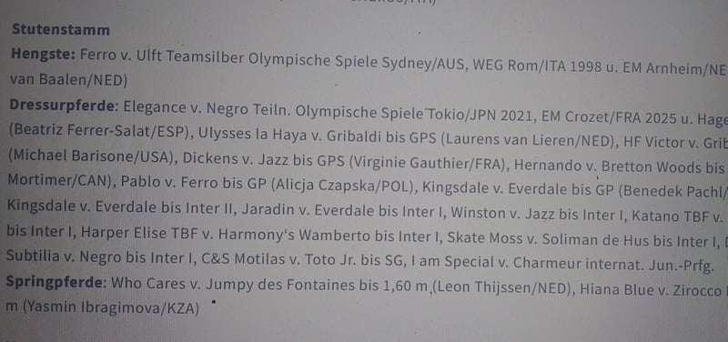 10 j StprSt , ca 170 cm ....4 und 5j siegreich in Aufbau Prüfungen !!!! Hatte bis jetzt 3 Fohlen , davon 2 Auktionsfohlen.....!!!! Direkter Stamm des Olympia Hengstes Ferro !!!!!!!! Viele Auktionspferde und gek. Pferde aus diesem Stamm . Tragend vom Hengst Secret für 4/26 !!!!! Nur in gute Züchterhände, wegen Aufgabe der Zucht, abzugeben! Bei Interesse bitte unter +491739558692 melden