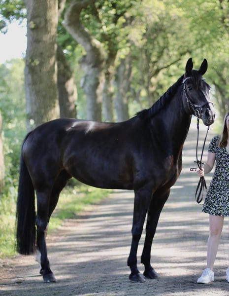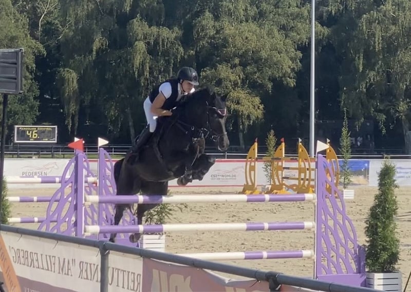 With a heavy heart, I have to part with my 13-year-old mare Val d’Isere N due to professional reasons. Valli impresses with an elegant appearance, three excellent basic gaits, and a consistently stylish jumping technique. She is very well-behaved both in handling and at competitions, making her ideal for amateur riders. In daily work, she is sensitive to ride and is familiar with trail riding, even without a saddle. In her last competition season in 2023, she won classes at L and M* level and placed in M** jumping. Subsequently, I bred her due to professional commitments, and in spring 2025, she foaled a colt by Cador. Since December 2025, Valli has been back in work under saddle and was able to impress immediately in 2026 with clear rounds and placings at her first competitions again. She is healthy, well-behaved for the farrier, loading, and trail riding, etc. A very good pre-purchase exam from 2021 is available. I am happy to answer further questions or send videos.