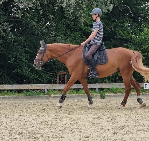 Our mare is honest, well-behaved, and easy to ride for most riders, but she is not suitable as a beginner's horse. Due to an issue with both front legs, she is limited in demanding dressage work or jumping training. She has been trained up to L-level dressage, and has achieved placements in A-Dressage. She has also been ridden up to A-level in jumping. She truly enjoys cross-country riding – whether alone or in a group, she remains calm and reliable. She also loves ground work. In handling, she is a truly trustworthy partner: very affectionate and human-oriented, she is uncomplicated when it comes to shoeing and loading, making daily handling easy. We are looking for a loving home for her with a family environment, where she can have plenty of turnout and be appreciated as a leisure and trail horse.