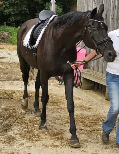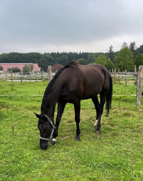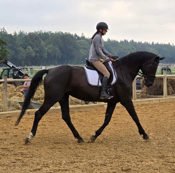 Wildrose is a beautiful, super brave 13-year-old mare with excellent dressage lineage and a wonderfully sweet, honest character. She possesses three outstanding basic gaits and an active hindquarters. She is exceptionally clear-minded, strong-willed, and remains calm and focused on her rider even in unfamiliar surroundings or situations. In handling, she is a treasure and very people-oriented and affectionate. She enjoys long grooming sessions and any kind of attention. Even children or inexperienced individuals can lead and groom her without any issues. Any bad habits are foreign to her, and she is very compatible with other horses. She is also familiar with living in a herd. However, when riding, she is not a beginner's horse, as she "wants to be ridden" and requires a very gentle hand. She is not suitable for anxious or insecure riders who hold on too tightly. Having spent several years in breeding, she is currently at a solid A level, with plenty of room for improvement. She is very obedient in pole work and enjoys going out into the countryside. We can also imagine her as a therapy horse. She loves being groomed or petted for hours and is very well-behaved and people-oriented in handling. She has been regularly vaccinated and has seen the dentist. X-rays from 2024 show no findings. A thorough veterinary examination from March 2025, before she was fully reintroduced to training, is also without findings. Currently, she lives in a box with daily year-round turnout. We wish for Wildrose a place where she is the number one for her people and enjoys full attention, as well as further development and engagement. Location: 82349 Krailling near Munich. A trial ride is possible upon request. Videos can be sent upon request.