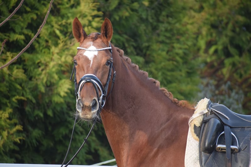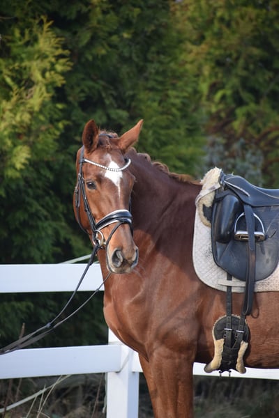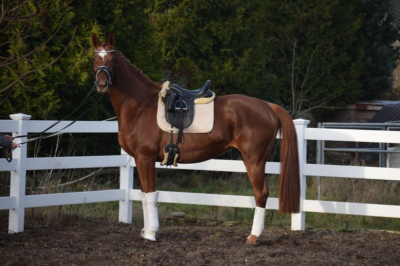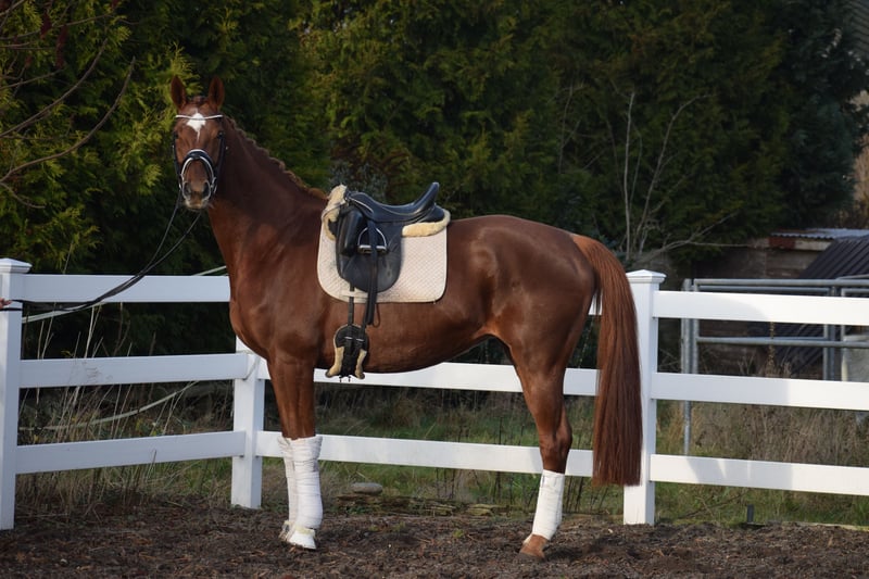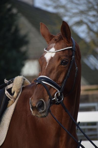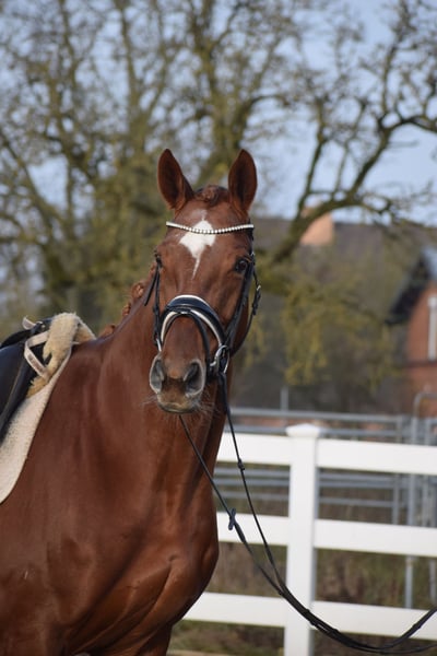 LEICHTRITTIGE, SCHÖNE & LIEBE DRESSUR LEHRMEISTERIN MIT TYP UND GANG - PLATZIERT - 5 FOHLEN - PSG NIVEAU - PIAFFE - Junioren geeignet! Zum sofort Lostreiten! Zum Verkauf steht, in Vertretung des Besitzers, diese, mit auffälliger Mechanik ausgestattete, 13 j., platzierte, Zucht erfolgreiche, 174cm große, hannoveraner dunkelfuchs Stute mit leistungs- und härte-geprägter Abstammung von FLORISCOUNT x AARKING XX. "Fleur de Lys" konnte sich bereits als Jungpferd auf dem Turnier in starken Starterfeldern behaupten und kann platzierungen in Dressurpferdeprüfungen der Klasse A (7,2) über L (7,5) bis M (7,8 / 3. Platz) vorweisen. Aufgrund Ihrer modernen Abstammung, dem harmonische Gebäude und dem guten Interieur, wurde Sie daraufhin in der Zucht eingesetzt und brachte 5 sehr gelungene Fohlen. Sie steht im Hannoveraner Hauptstutbuch. Wieder in Arbeit unter dem Sattel, ist diese Stute immer Leistungsbereit, zeigt spielerisch ihre bereits vor Jahren ernernten hohen Lektionen, ruft diese schnell ab und erfeut sich an der täglichen Arbeit. Sie ist in der Arbeit unerschrocken, abgeklärt, leichtrittig, fehler verzeihend und mit feiner Anlehnung bei guter Selbsthaltung - daher ist Sie absolut Juniorengeignet und eine tolle Lehrmeisterin. "Fleur de Lys = Lilie" ist wie Ihr Name schon verrät, wunderschön und weiß mit typvollem Gesicht, harmonischem Gebäude und wirklich tollem Seitenbild zu imponieren. Mit Ihrer Abgeklärtheit und einem Herz aus Gold, bereitet Sie einem im Umgang und in der täglichen Arbeit immer Freude. Die Tatsache, das Sie mit 13j. und 5 Fohlen, bereits alle S* / PSG Lektionen, sowie die meisten INTER I Lektionen, sowie PIAFFE beherrscht, beweißt Ihr hohes maß an Rittigkeit; Leistungs-, Ausbildungsbereitschaft und freude am Sport. Setzt sich "Feur" in Bewegung, zeigt sich eine leistungsbereite Sportlerin mit freude am großen Gang. Sie besticht durch Ihr auffällig schönes Seitenbild, mit guter Selbsthaltung und natürlicher Aufrichtung. Dadurch entwickelt Sie die Schwunghaften Gangarten mit viel Mechanik, Einkelung und Knie toll ins Bergauf, mit auffällig freier Schulter und gut heran geschlossener Hinterhand. Ihre feine Anlehnung und gute Rückentätigkeit machen es dem Reiter leicht, "Fleur" mit feinen Hilfen zu bedienen. Wer also ein LEHRMEISTER, aber auch eine liebe FREUNDIN zum Schmusen sucht, der ist bei "Fleur" genau richtig. Eine echte gelegenheit ein tolles Pferd zu erwerben. Gerne kann "Fleur" nach dem Kauf auch bei uns im professionellen Beritt verbleiben und auch auf Turnier vorgestellt werden. Ein aktueller, guter, klinischer und röntgenologischer (Standart + Rücken) TÜV liegt vor.
