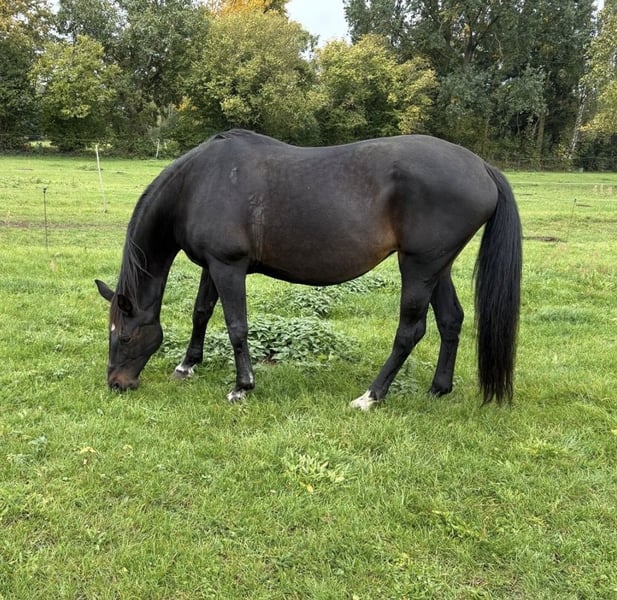 My beloved 17-year-old mare (Hofrath x De Niro) is looking for a lovely new home. She has had three wonderful foals so far (with her previous owner), the most recent in 2024, and since August, I have been riding her sporadically in the field or on the pasture, as well as lunging. She is well-behaved in handling, and the farrier is no problem. Under saddle, she still needs a bit more training; I have only worked on canter at the lunge so far. Her trot is lively and comfortable. Unfortunately, I lack the time for more intensive training, as I can only ride her irregularly—sometimes several times a week, but other times not for several weeks. She needs consistent work, especially after her foal rest, to get her properly forward and engaged. She is 1.73 meters tall. If everything fits, her companion (a 20-year-old gelding, limited riding ability) can also be rehomed together. Place before price, we look forward to getting to know you.