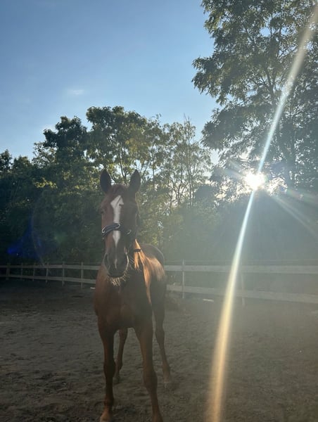 Yegua Hannoverana, nacida en mayo de 2007, con una altura de 1,73 m. Debido a artrosis en la articulación del carpo izquierdo, solo es apta para montar de forma limitada, aunque también resulta interesante para la reproducción. Pedigree: Embassy I / Weltruhm. Enny proviene del mundo del salto (hasta nivel L) y actualmente se monta solo como pasatiempo. Es importante montar con suavidad y solo cuando no presenta cojeras. En 2016 tuvo un potrillo y lo afrontó de manera excelente. Enny conoce tanto el establo abierto como las boxes, así como manadas mixtas y grupos solo de yeguas, en las que suele tener un rango alto en la jerarquía. Se siente más cómoda en una box con paddock. También es importante para ella que pase suficiente tiempo en manada. Es tranquila tanto en el manejo en tierra como en la montura y, una vez que se ha ganado su confianza, hace casi todo con gusto. Siempre intenta complacer. Conoce el trabajo en tierra y también hace una buena labor en la cuerda. Busco a alguien que quiera mantenerla activa de forma variada. No es adecuada para niños ni principiantes, necesita a alguien que la desafíe y le brinde seguridad, pero siempre de manera justa.
